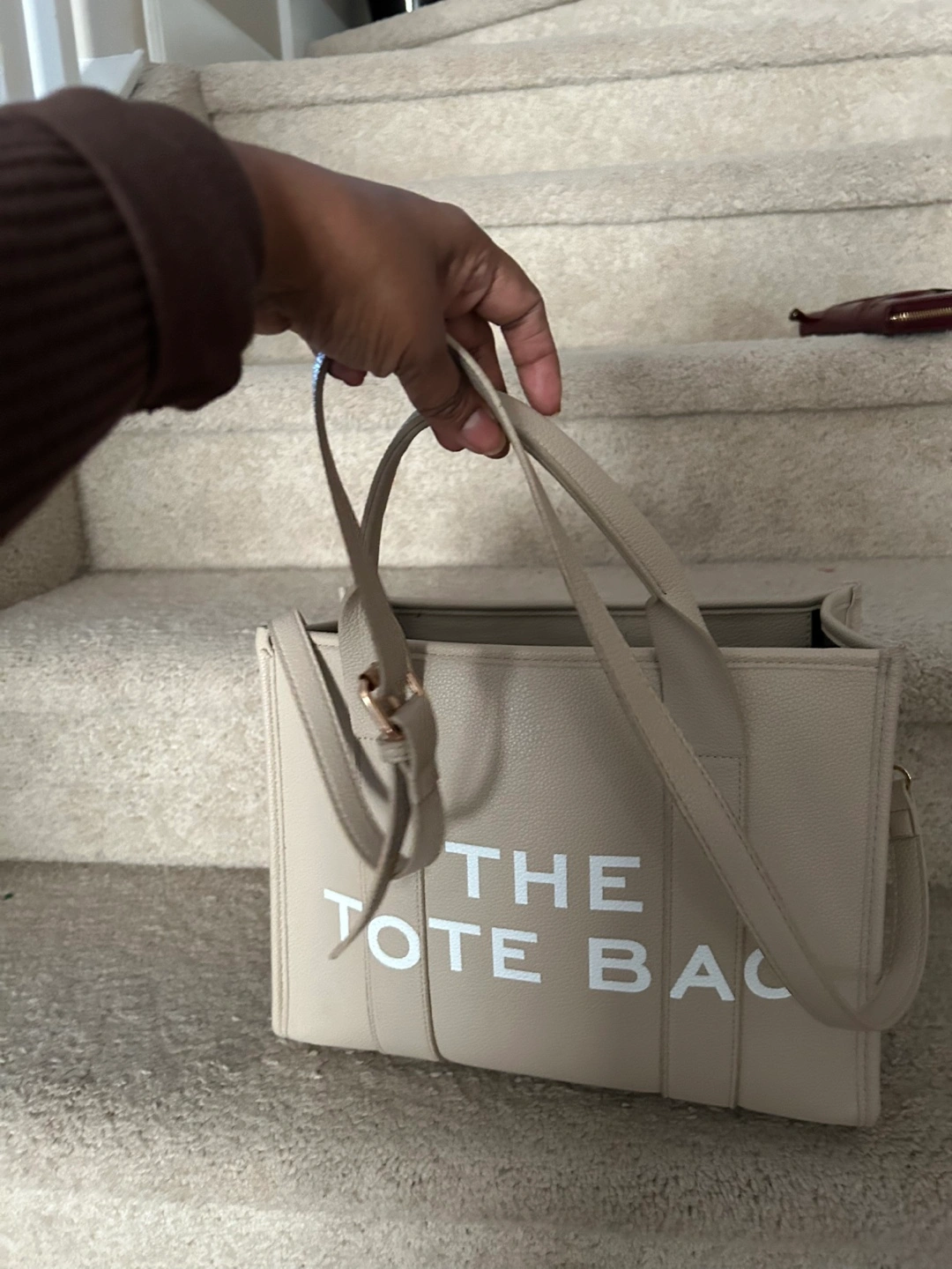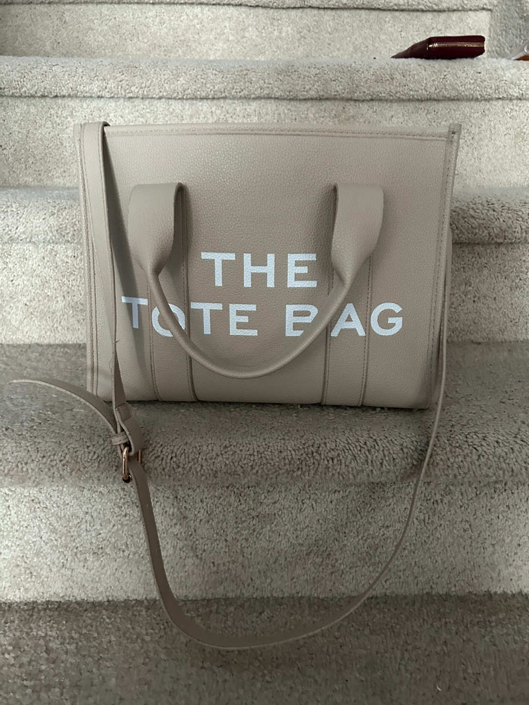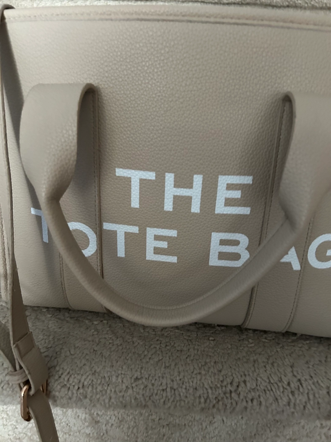 Beige tote bag with adjustable strap. Has two top handles. Inside is a small pocket.