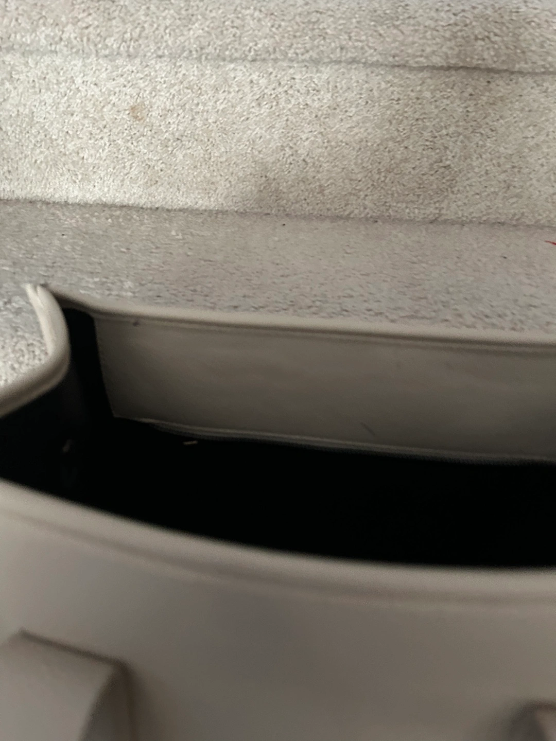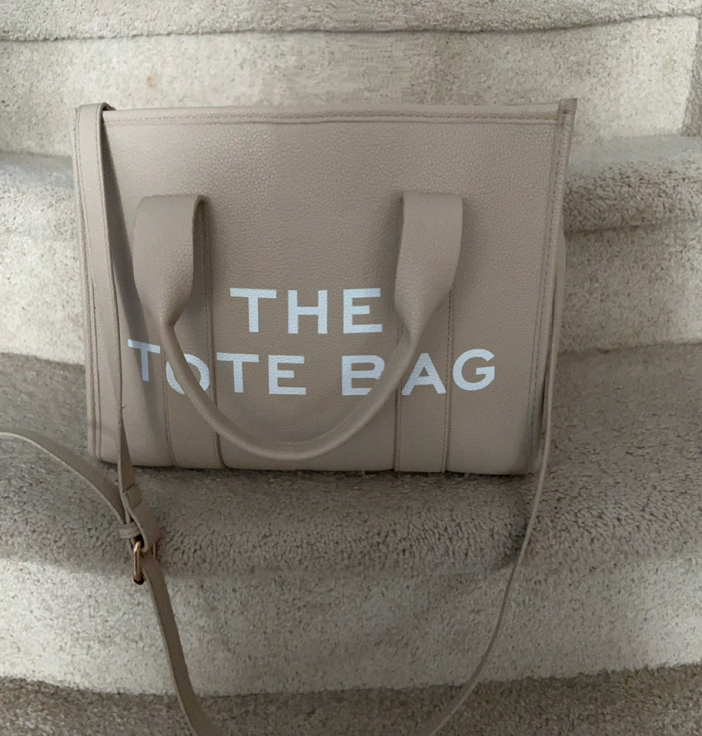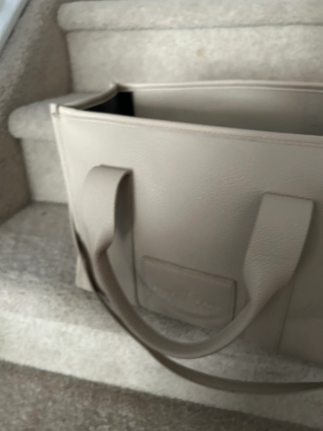 Beige tote bag with adjustable strap. Has two top handles. Inside is a small pocket.