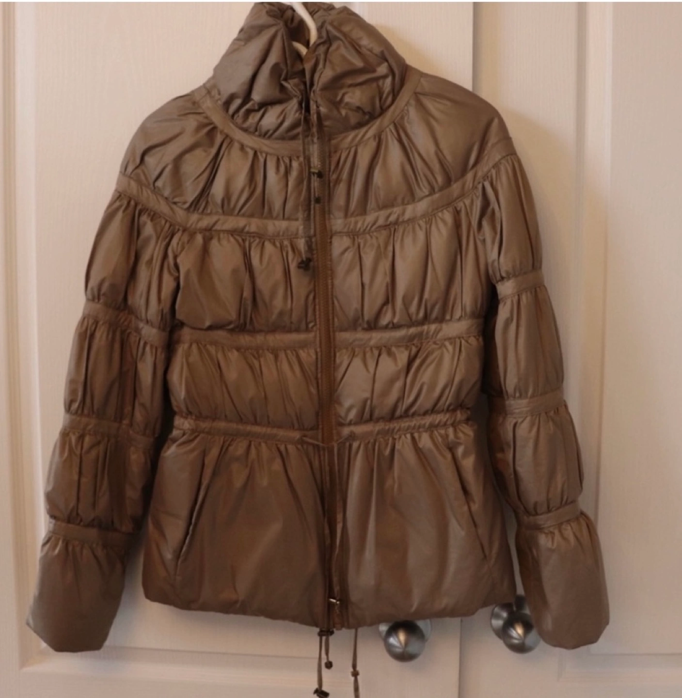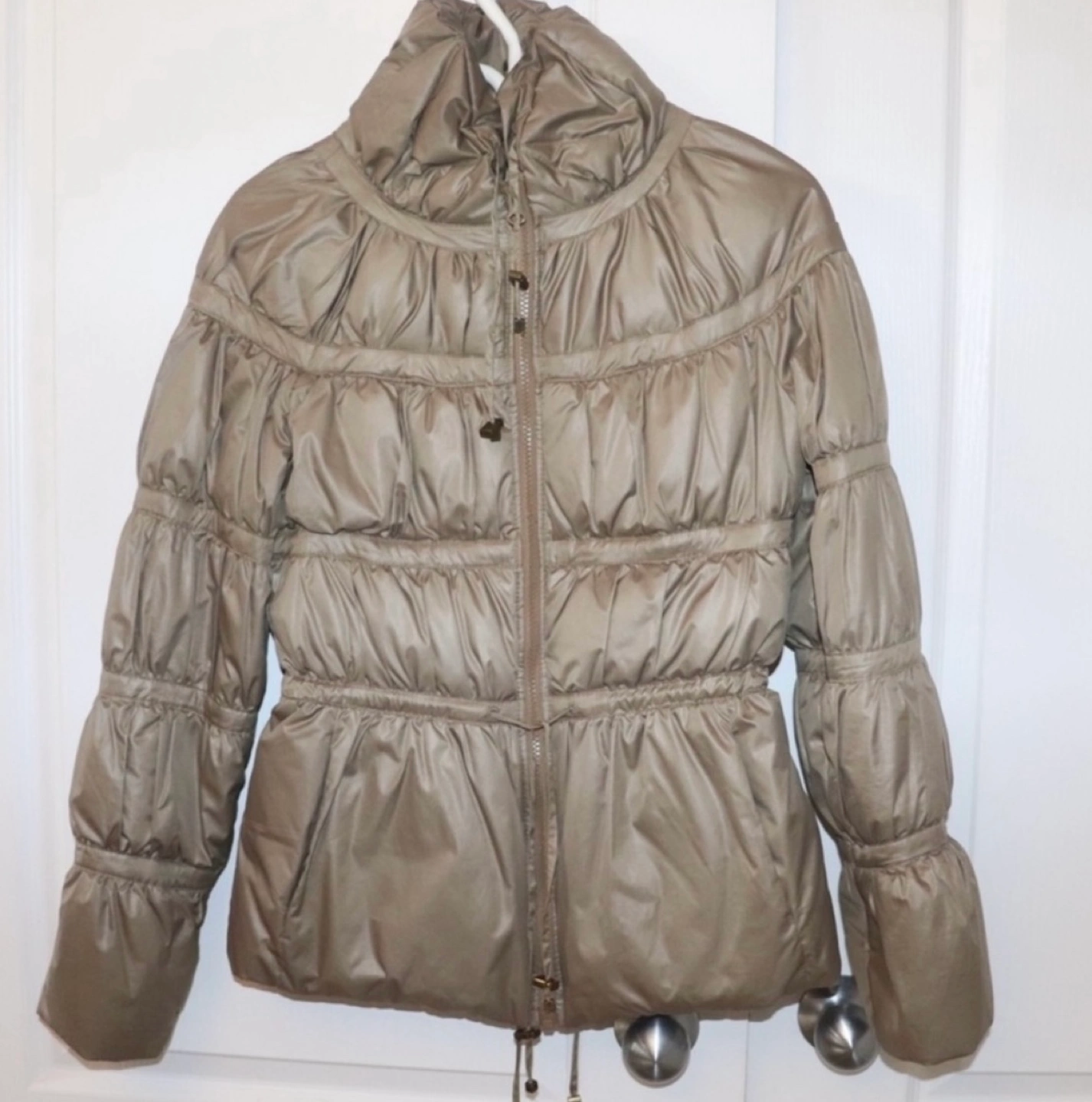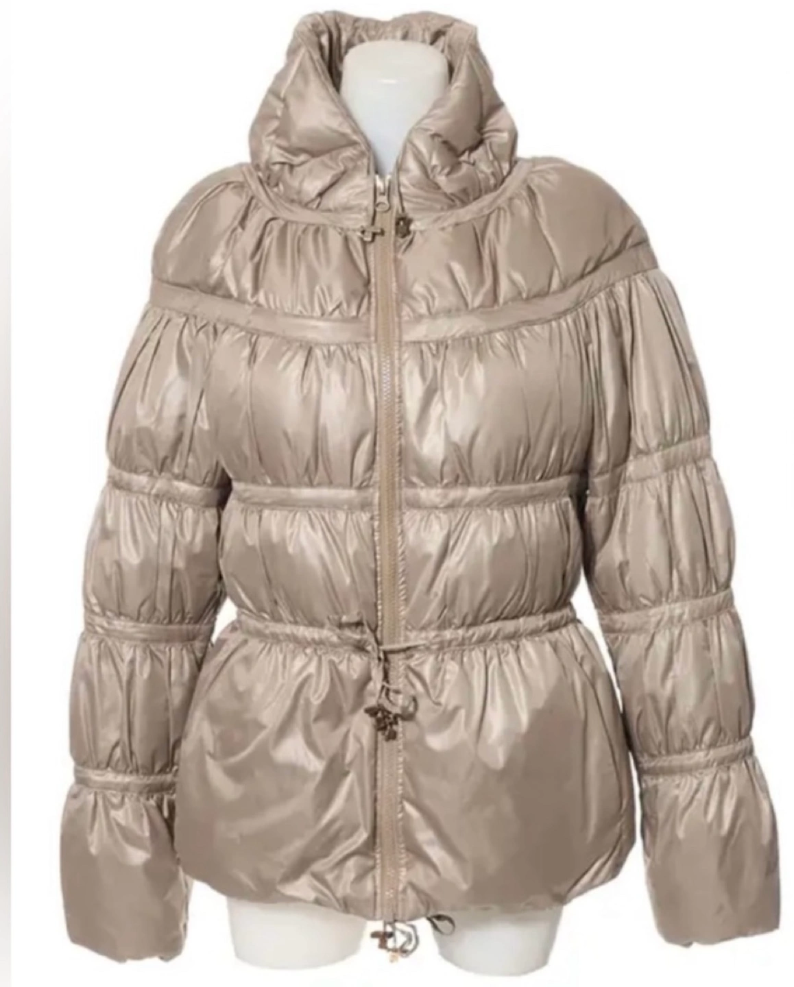 Light brown puffer jacket with a cinched waist and a high collar. Zipper closure and a drawstring at the bottom. Long sleeves with a slightly puffed detail.