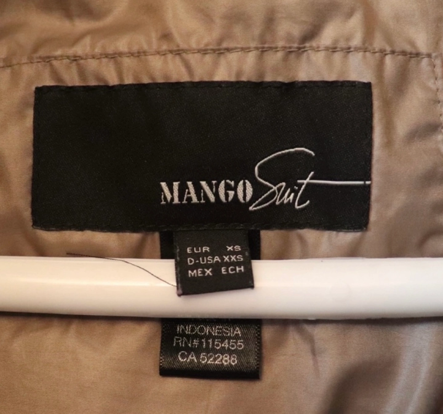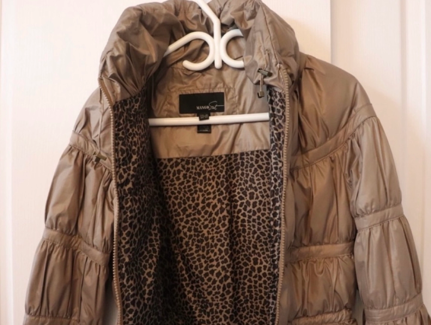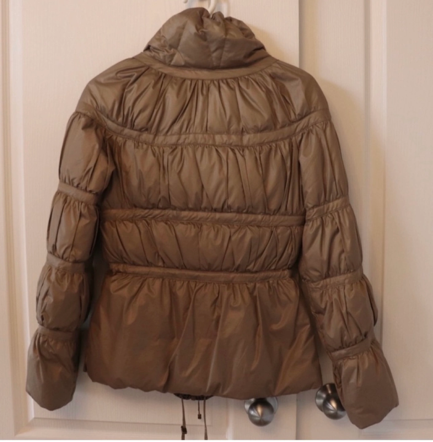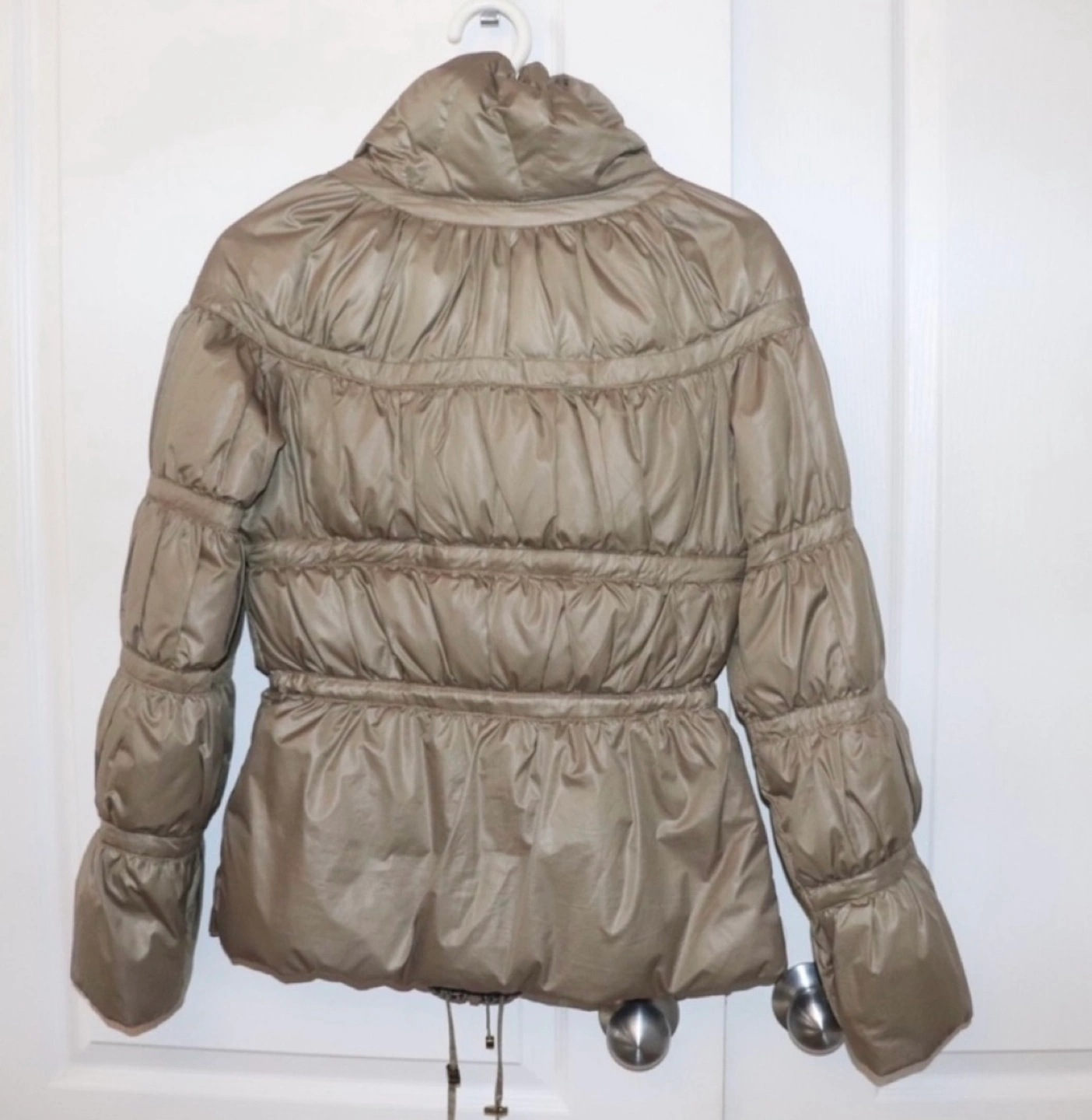 Light brown puffer jacket with a cinched waist and a high collar. Zipper closure and a drawstring at the bottom. Long sleeves with a slightly puffed detail.