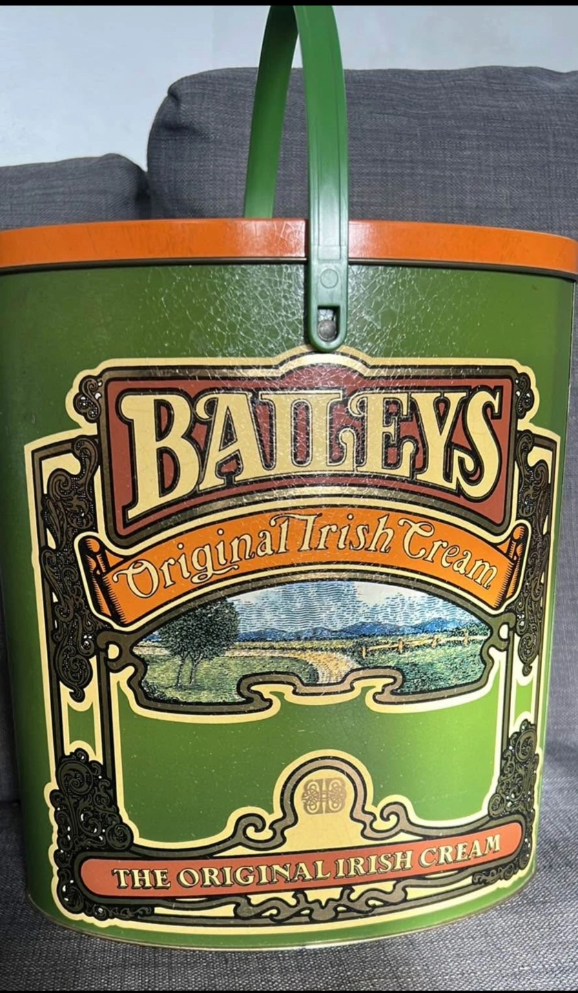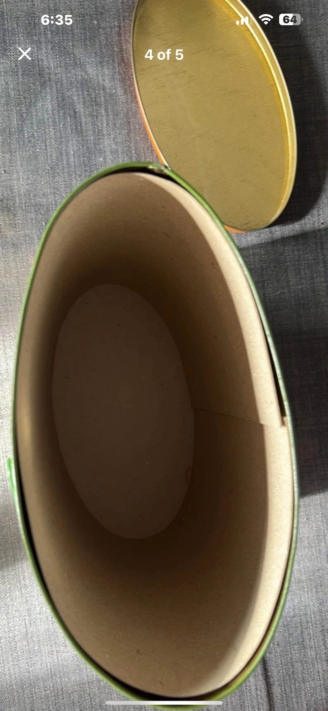 Vintage 1970’s tin canister. Green, orange, and gold with a green handle. Made in England.