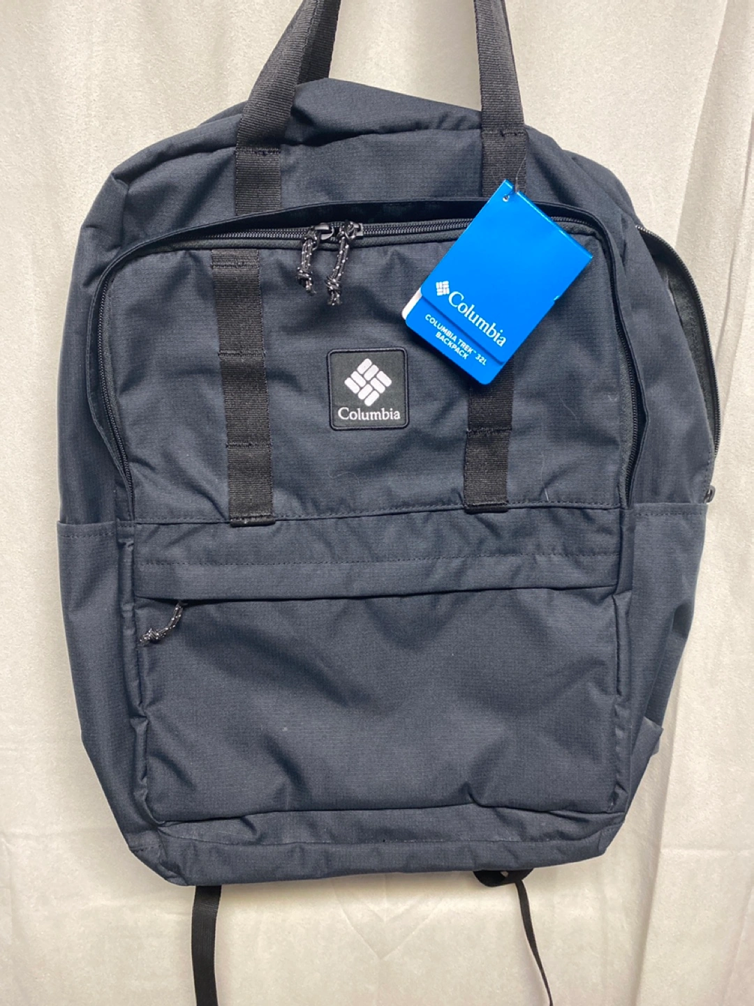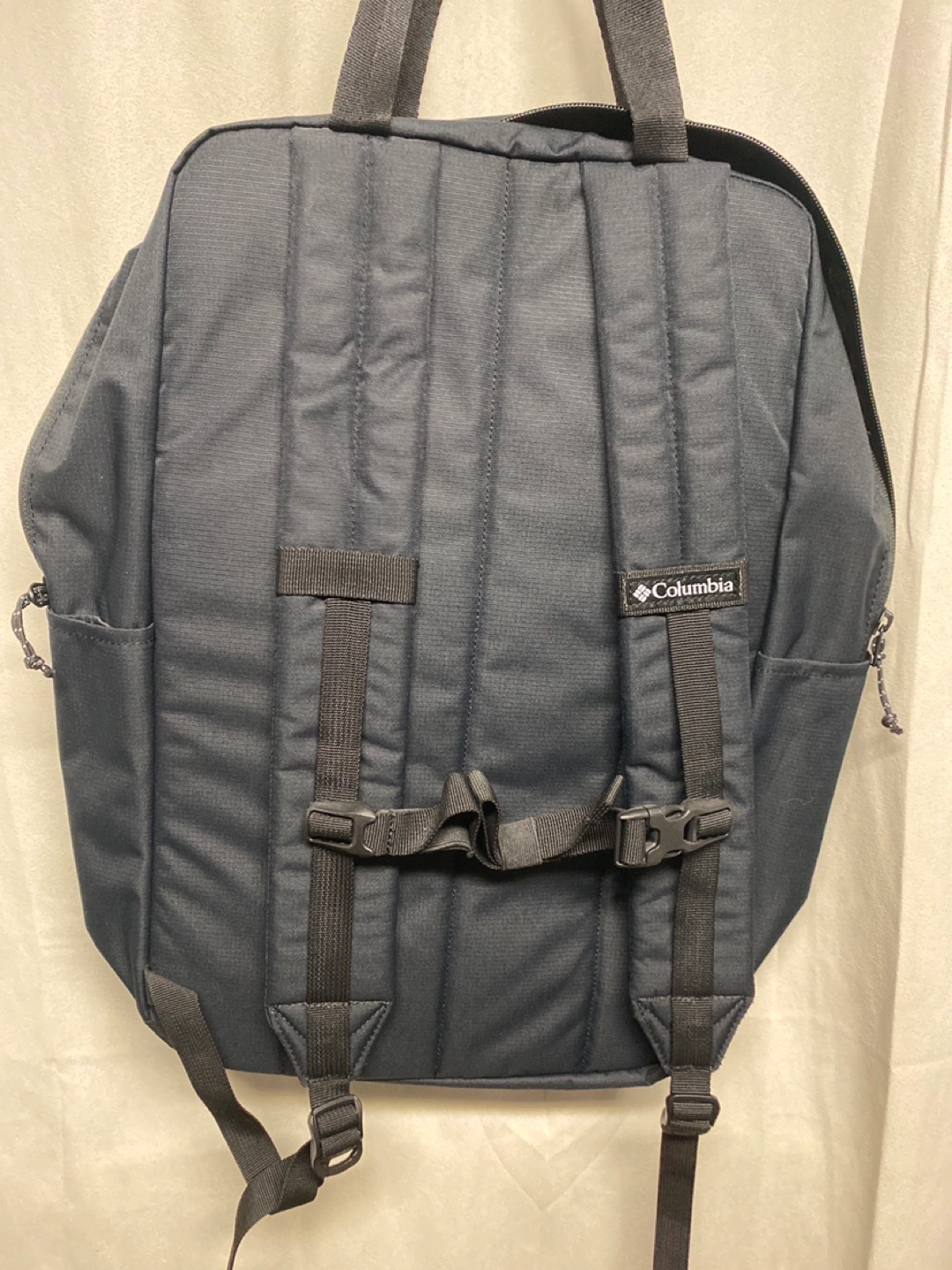 Black backpack with multiple pockets and a large main compartment. Features adjustable straps. Size 19x16 inches