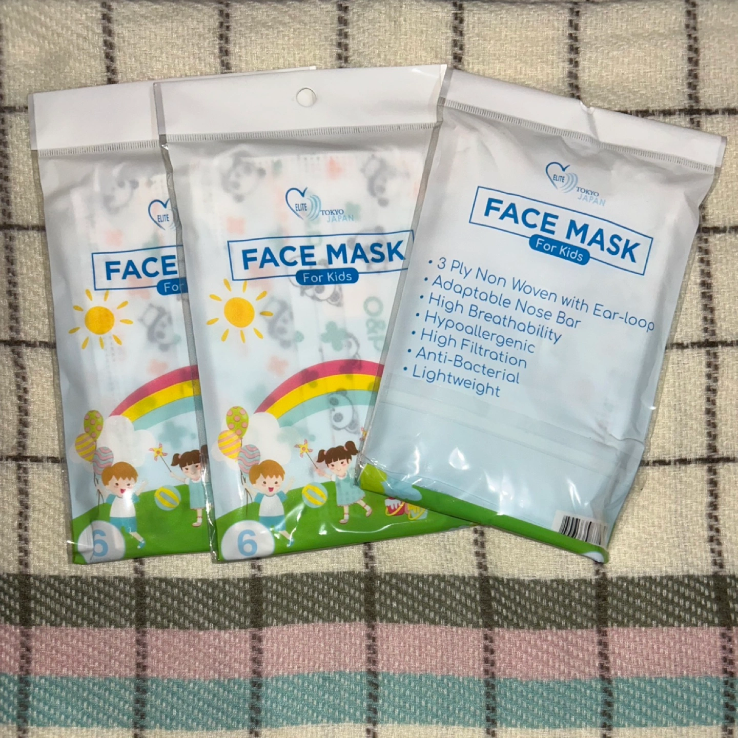 Elite Tokyo Japan Kids Face Masks 6pcs per pack $2 per pack $5 for 3 packs Three packs of children's face masks. Lightweight, hypoallergenic, and antibacterial. Features adaptable nose bar and high filtration. Pick up Near Lakeview Elementary School (Burnaby)