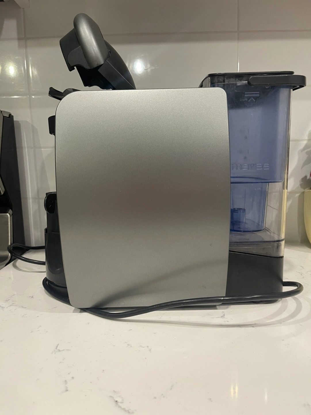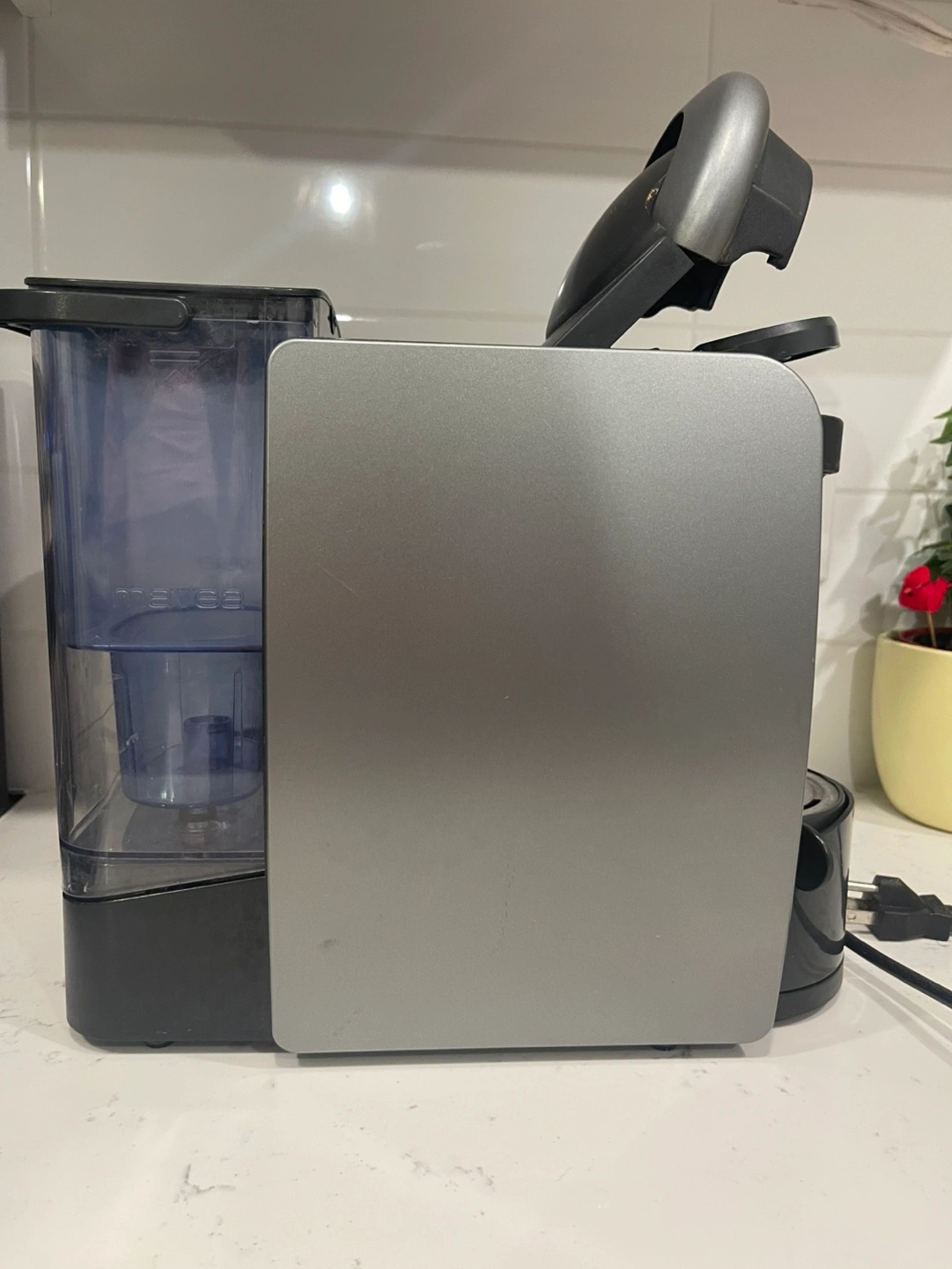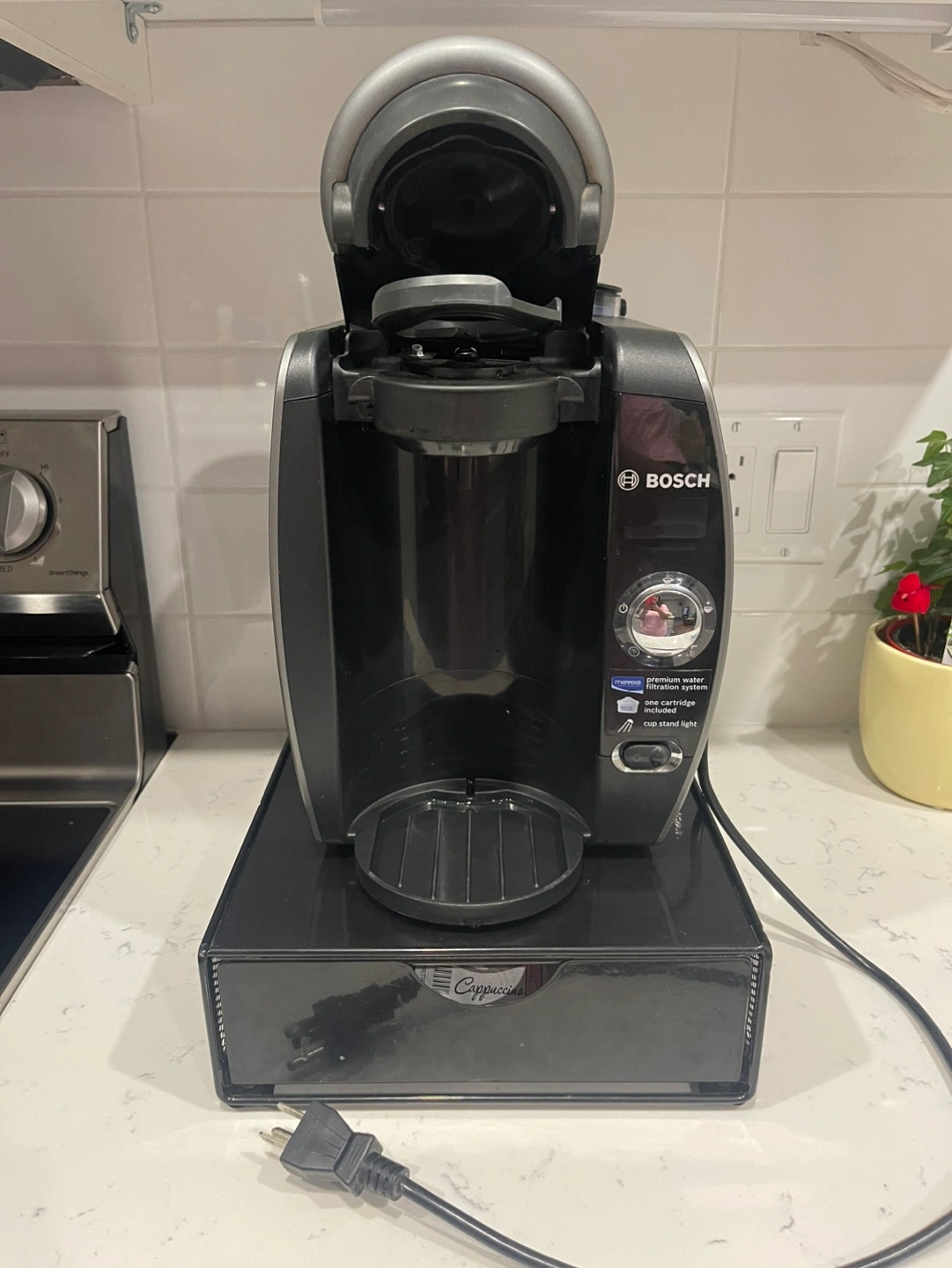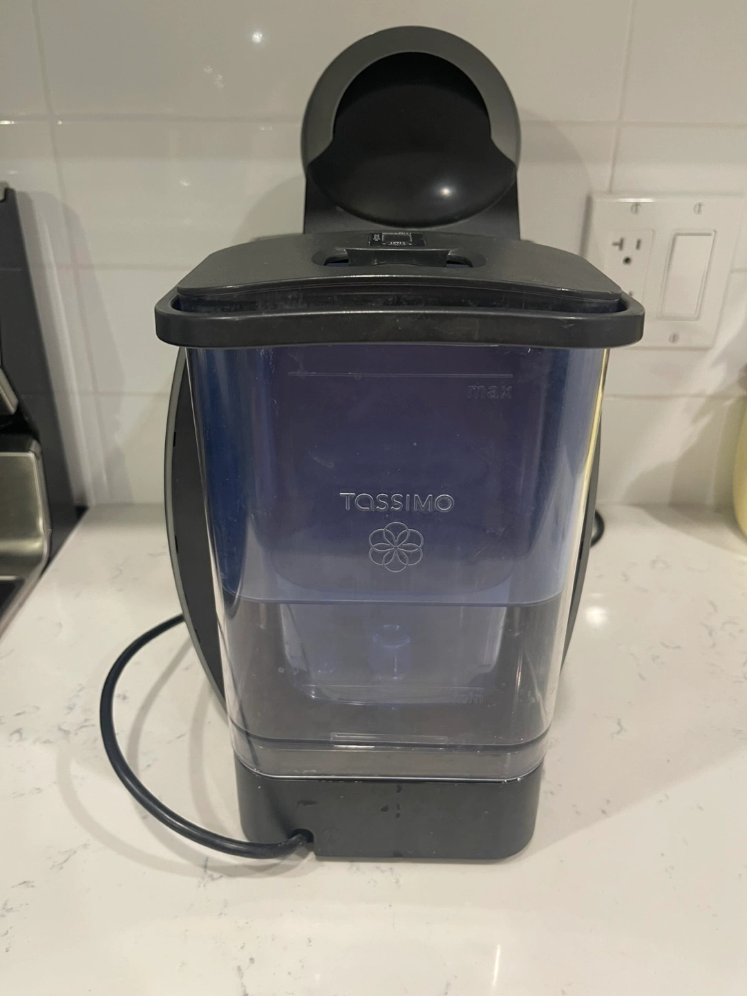 Used Bosch Tassimo coffee maker. Makes single-serve cups of coffee. Includes water reservoir. Good condition.