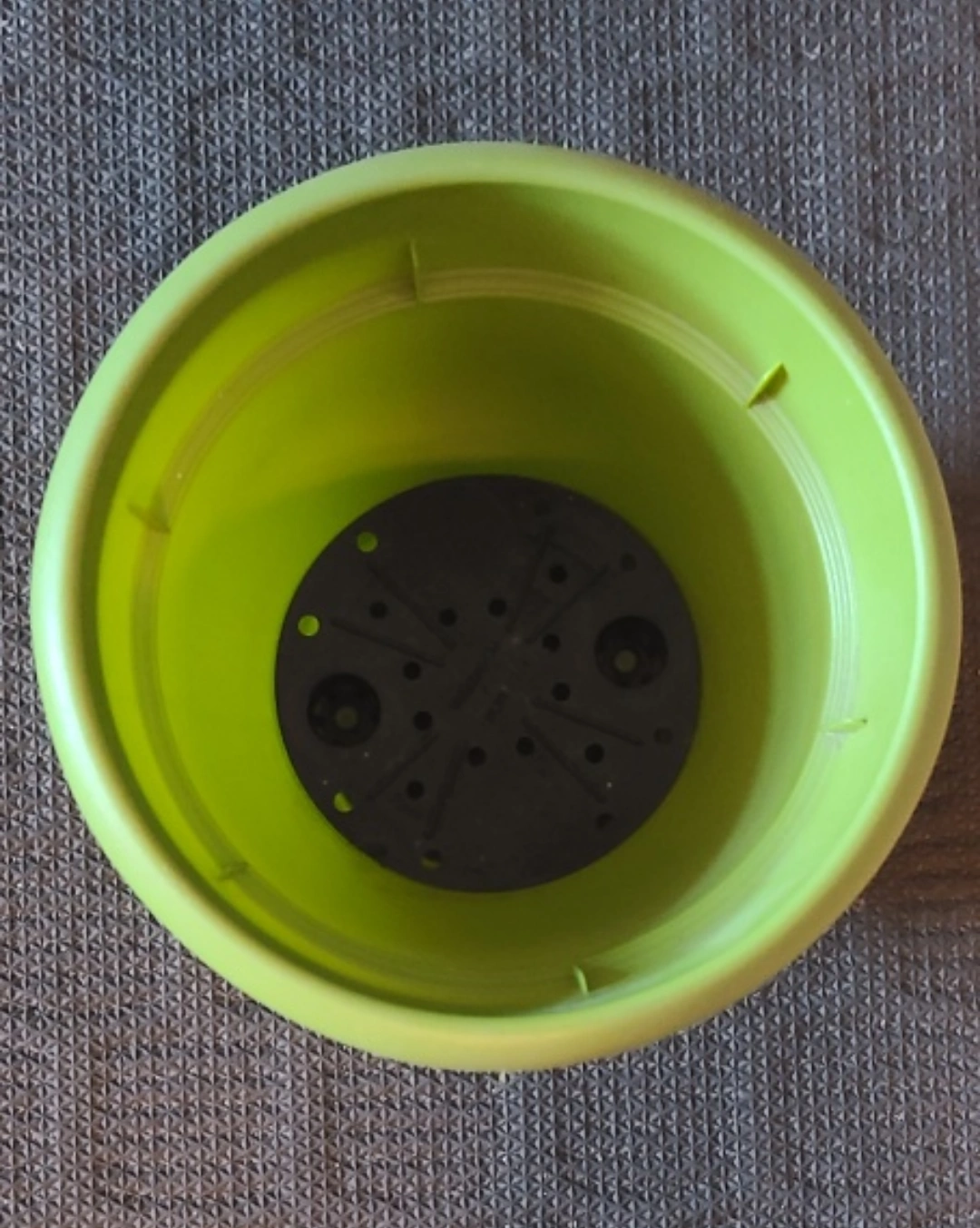 6 inch lime green plastic planter. Features drainage holes and a saucer. Good condition.