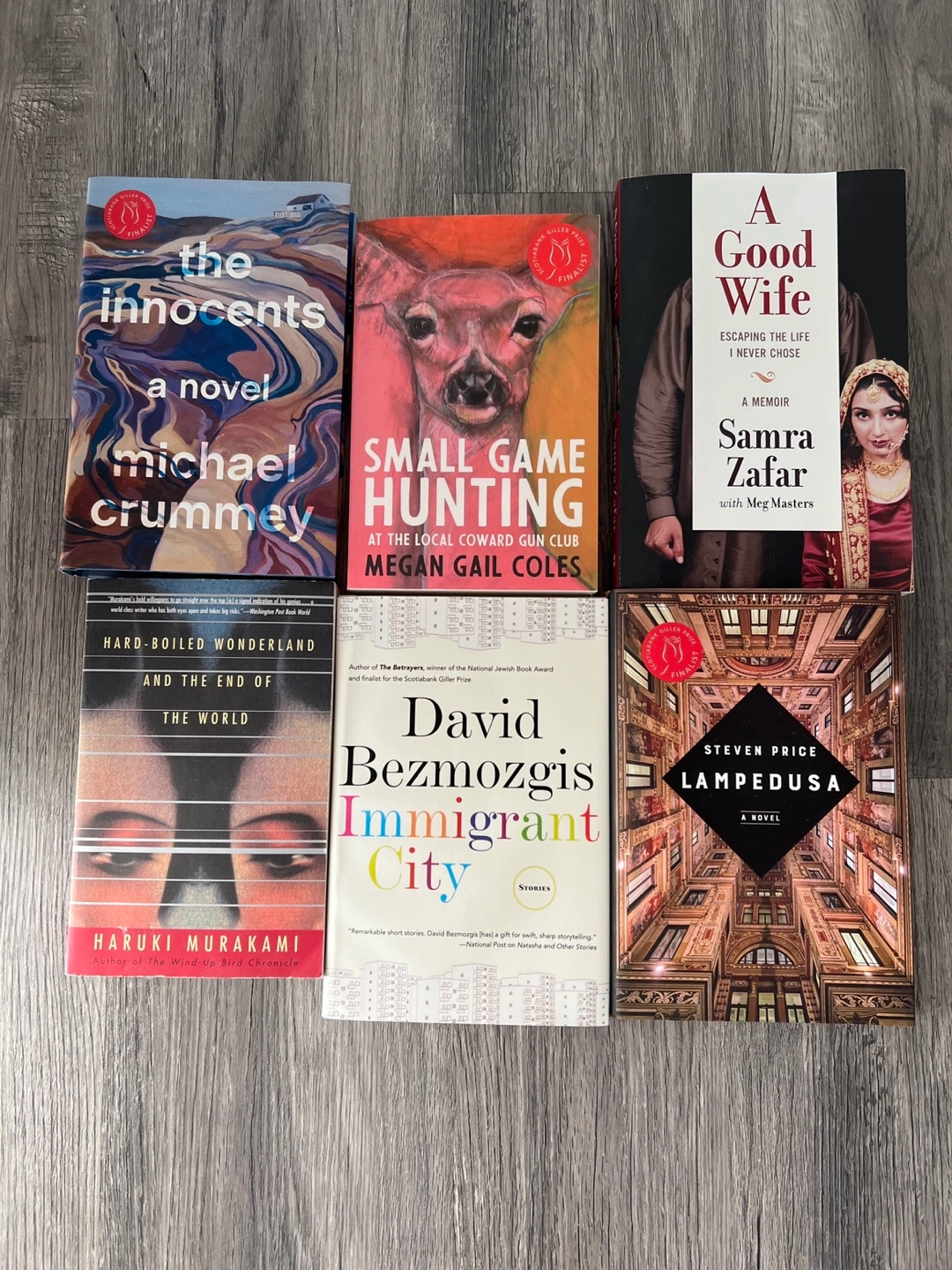 Bundle of six new books. Includes novels and memoirs. Authors include Michael Crummey, Megan Gail Coles, Samra Zafar, Haruki Murakami, David Bezmozgis, and Steven Price. Various genres represented. Scotia Bank Giller prize finalist.