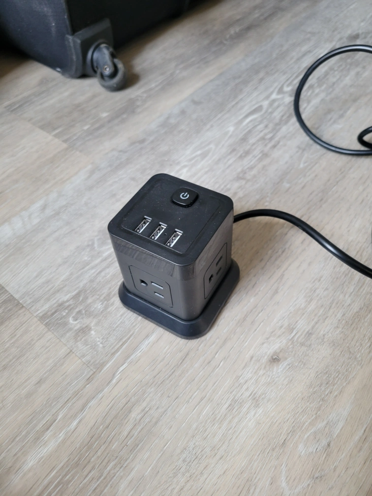 Compact power cube. Features three USB ports and two grounded outlets. Power switch included. Long power cord.