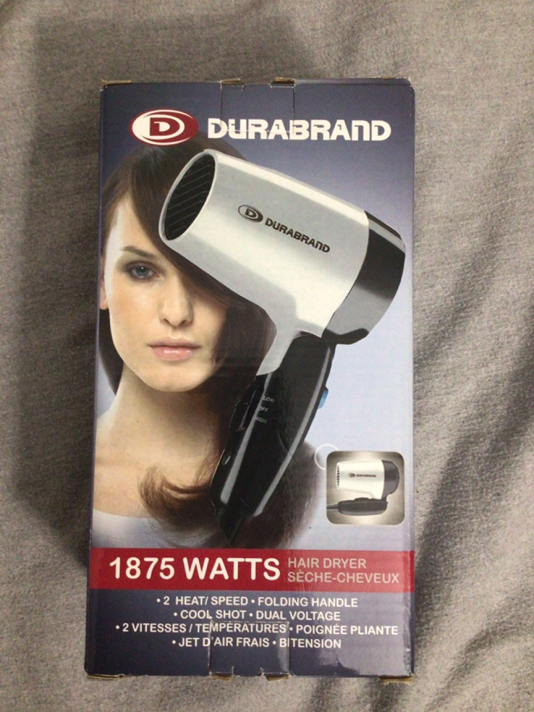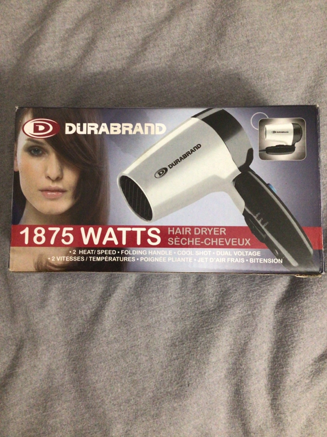 New Durabrand travel hair dryer. 1875 watts. Two heat/speed settings. Folding handle. Cool shot. Dual voltage. Brand new in box
