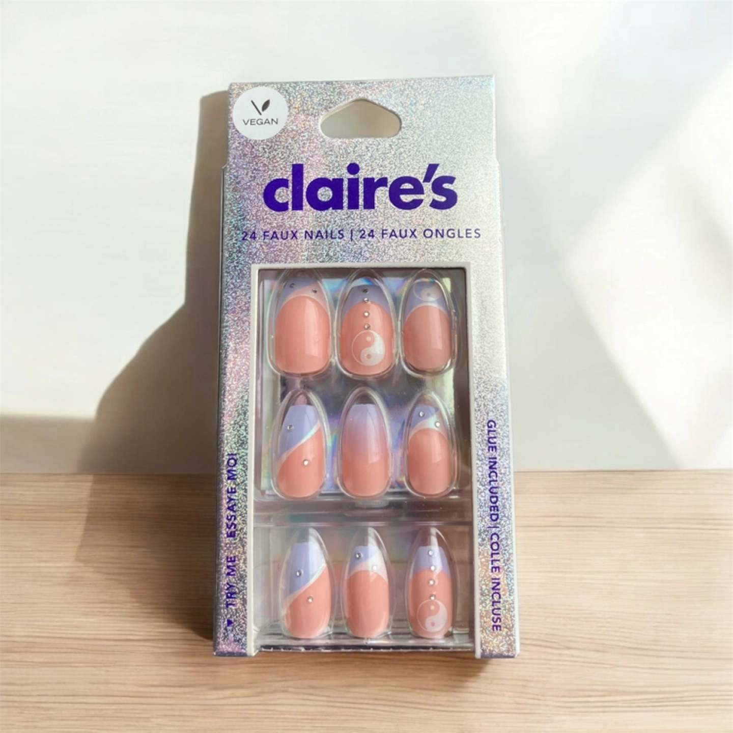 NWT Claire's vegan 24 faux nails. Glue included. Stylish faux nails with a peach, white and purple design. Includes 24 nails. Vegan-friendly. I ship using recycled material within my home to reduce waste. The package will be wrapped with care if requested or deliver for a fee