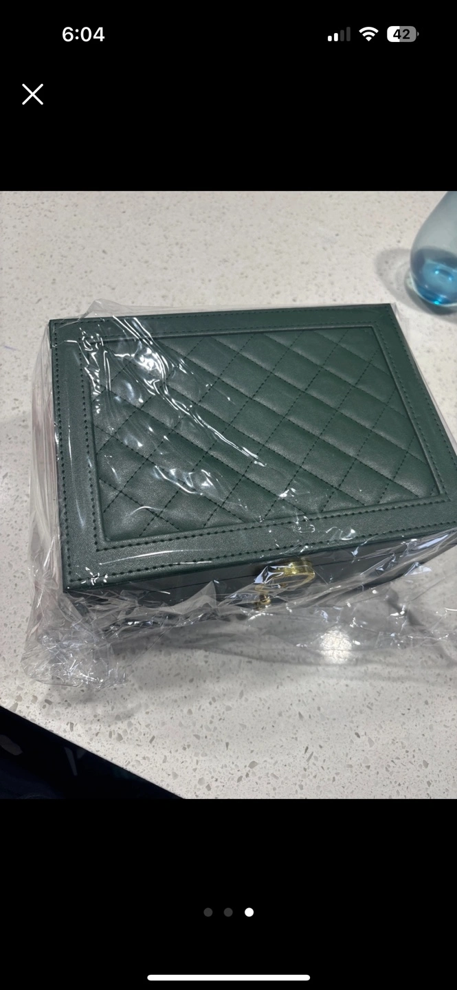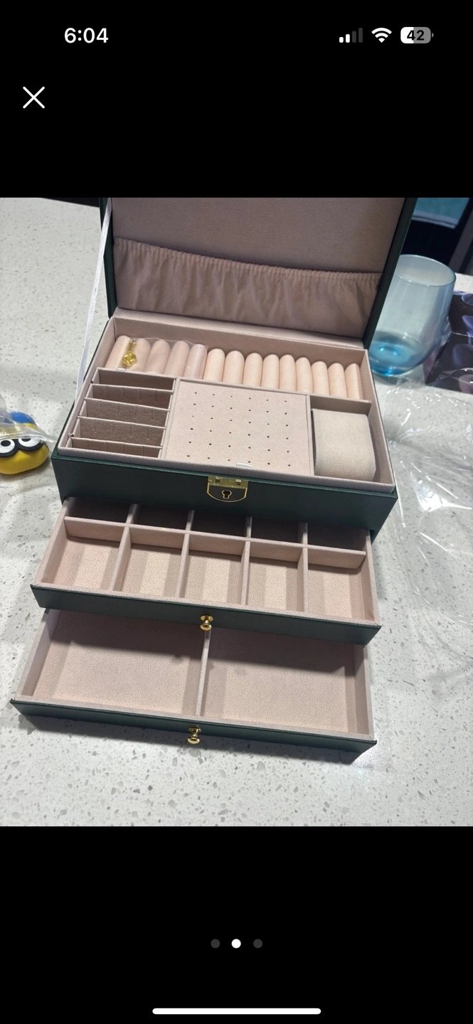 Brand new Three-tiered jewellery box. Features quilted dark green exterior, gold-toned hardware, and beige interior compartments. Perfect for storing and organizing jewellery.