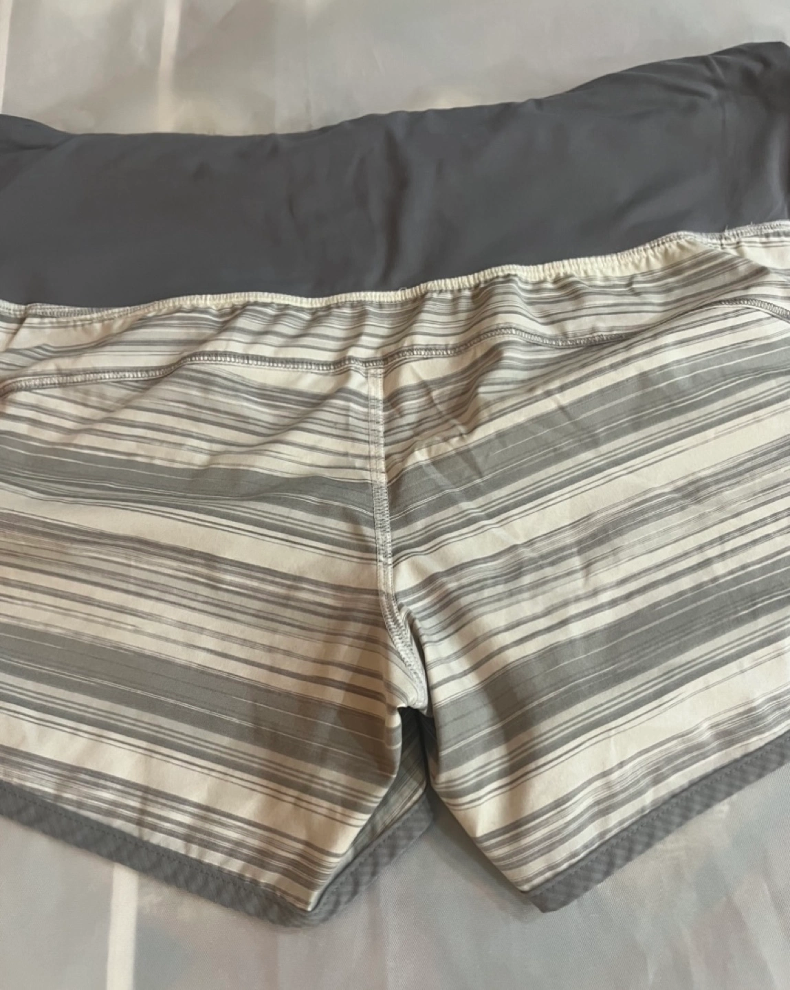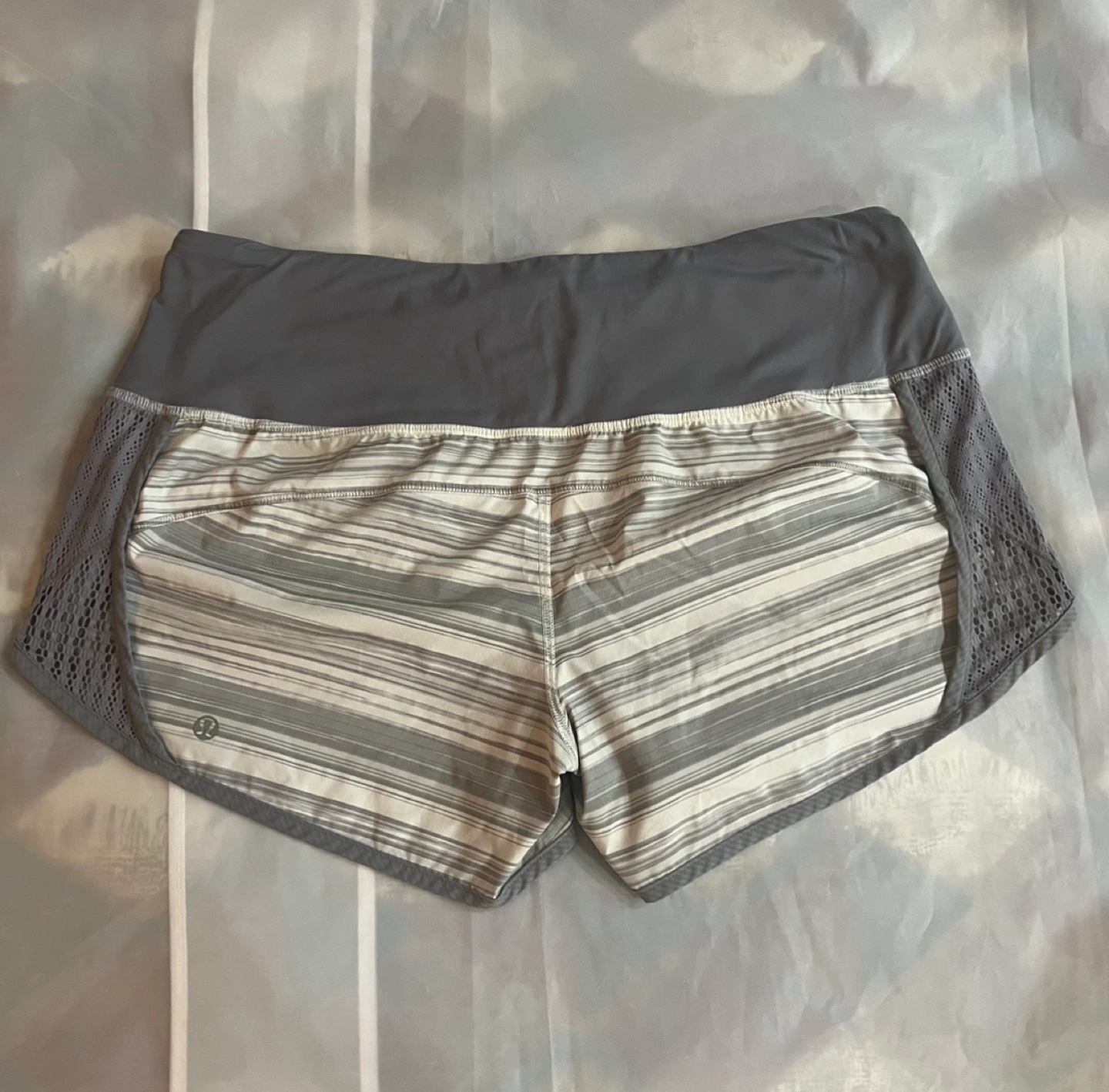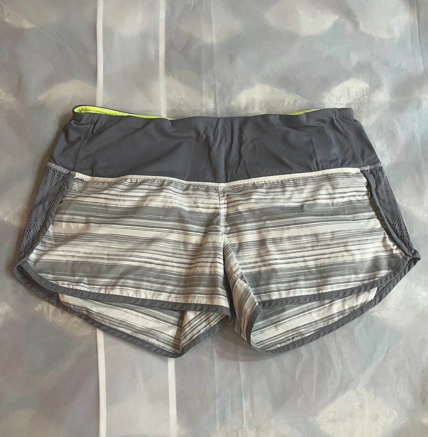 Women's athletic running shorts. Grey and white striped pattern. Mesh side panels for breathability. Zip pocket. Excellent for workouts. Excellent condition! Pickup Brampton or downtown Toronto Check all pictures for details Will add measurements asap! Description from website Why we made this: Shedding layers when the heat is high feels incredible, but going bottomless can make things a little awkward. We designed these lightweight run shorts with mesh venting up the sides to help keep us cool and breezy when we're sprinting in the sunshine. Rated PG. Key features • mesh panels keep your hot legs cool • three pockets thoughtfully designed to fit all your essentials • the smooth Luxtreme waistband wicks away sweat and won't dig in • cinch the continuous drawcord for a secure fit at the waist • chafe-resistant flat seams help reduce skin irritation Tech specs • designed for: run • fabric(s): Swift, Luxtreme • properties: moisture wicking, chate-resistant, two-way stretch, breathable, preshrunk • rise: high • inseam: 4" • hem sweep: 25 3/4" • liner: no