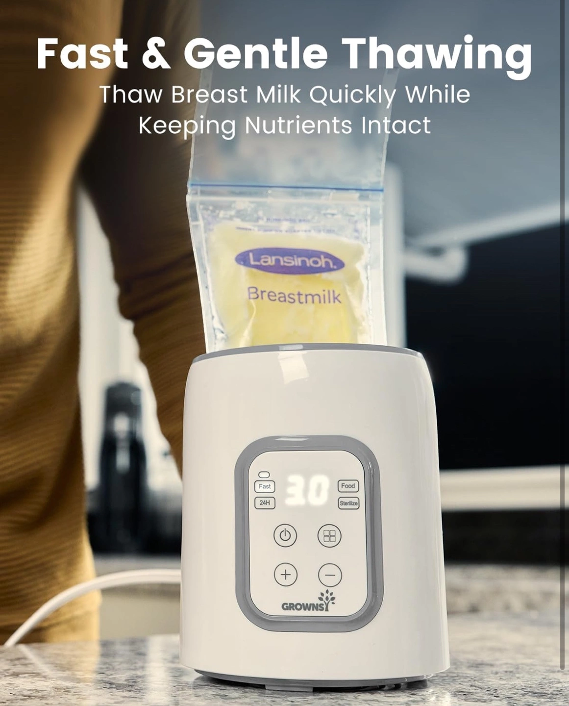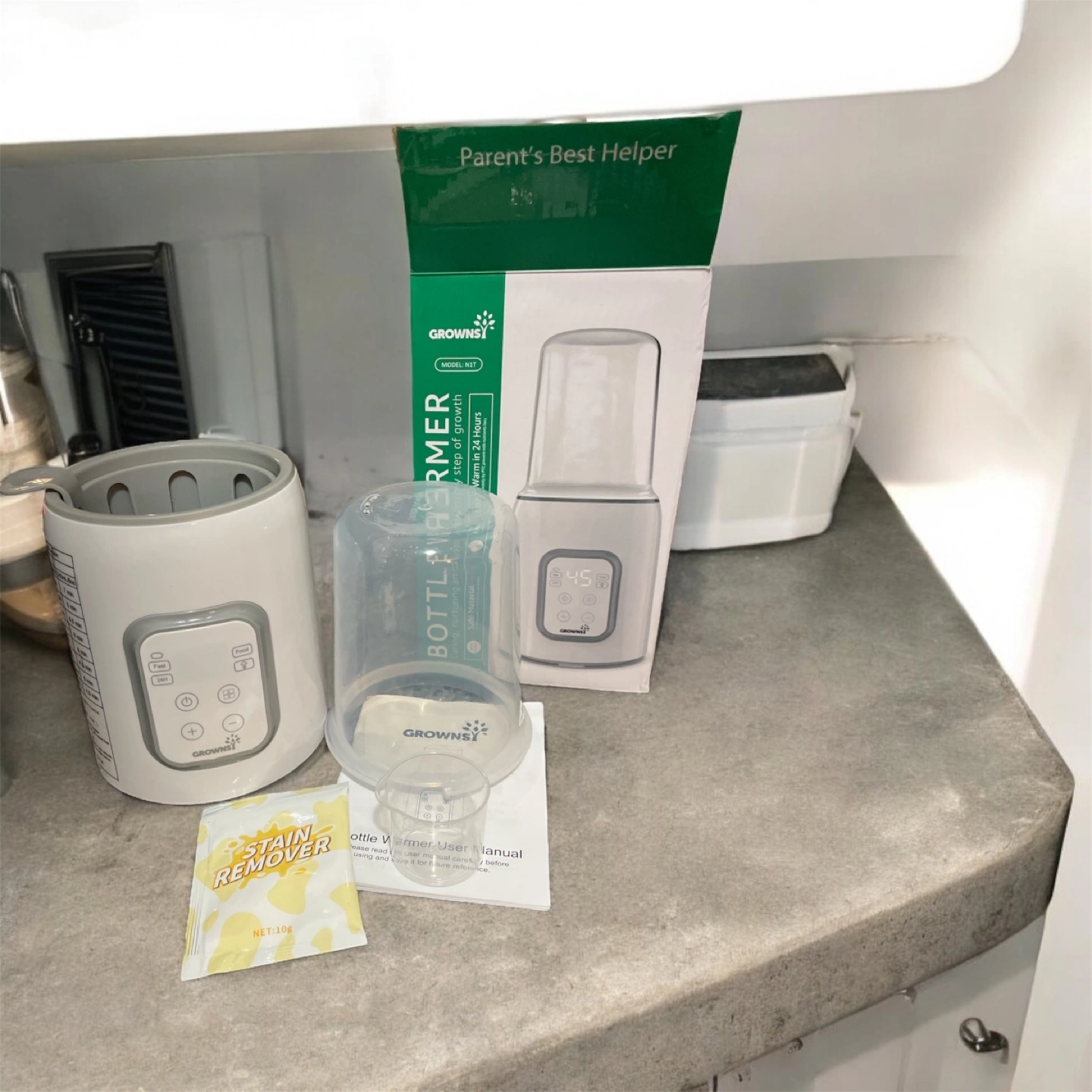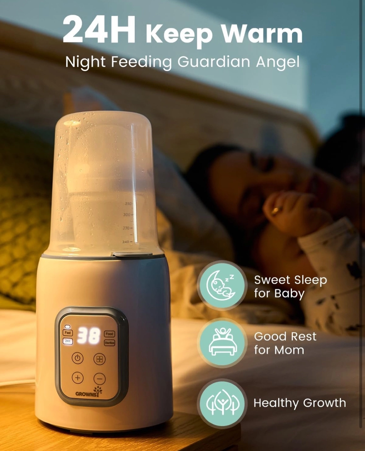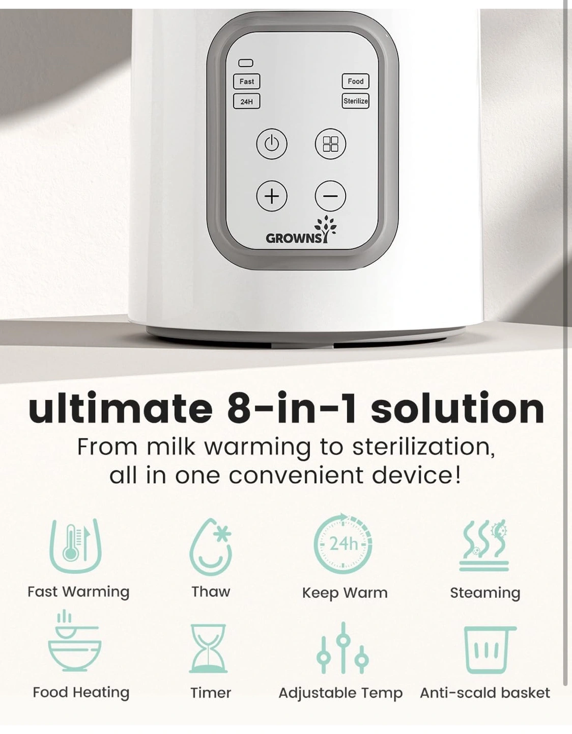 GrownSI bottle warmer and sterilizer. Eight functions: fast warming, thawing, keeping warm, steaming, food heating, timer, adjustable temperature, and anti-scald basket. Great for warming breast milk and formula. Includes measuring cup, instructions and stain remover.