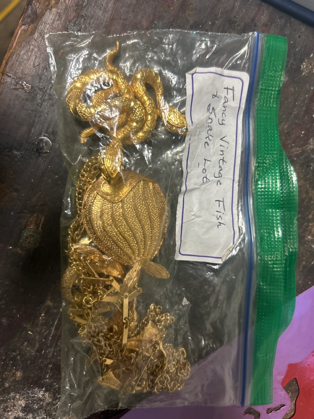 Fancy vintage lot. Includes gold-tone fish and snake pendants. Chains included. Great for jewellery making or collectors.
