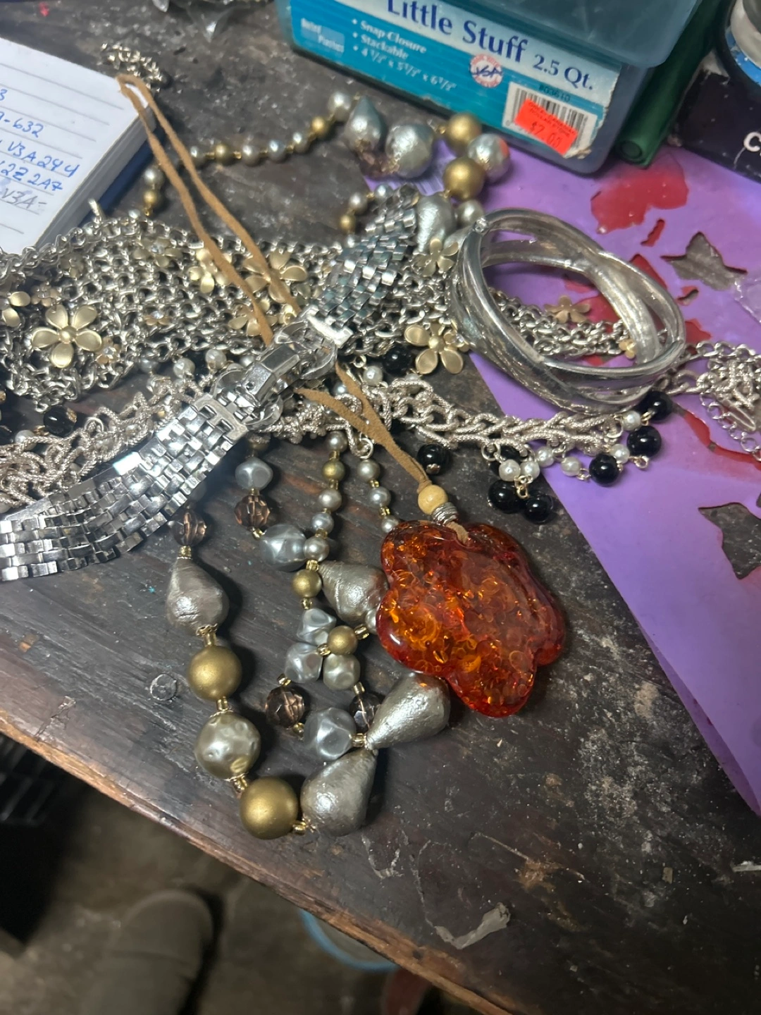 Assortment of necklaces and bracelets. Features silver-tone chains, beads, and pendants. Includes a unique amber pendant necklace. Various lengths and styles. Pre-owned.