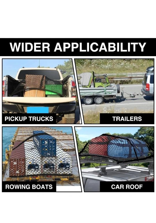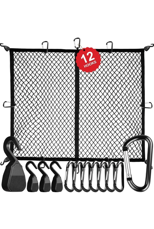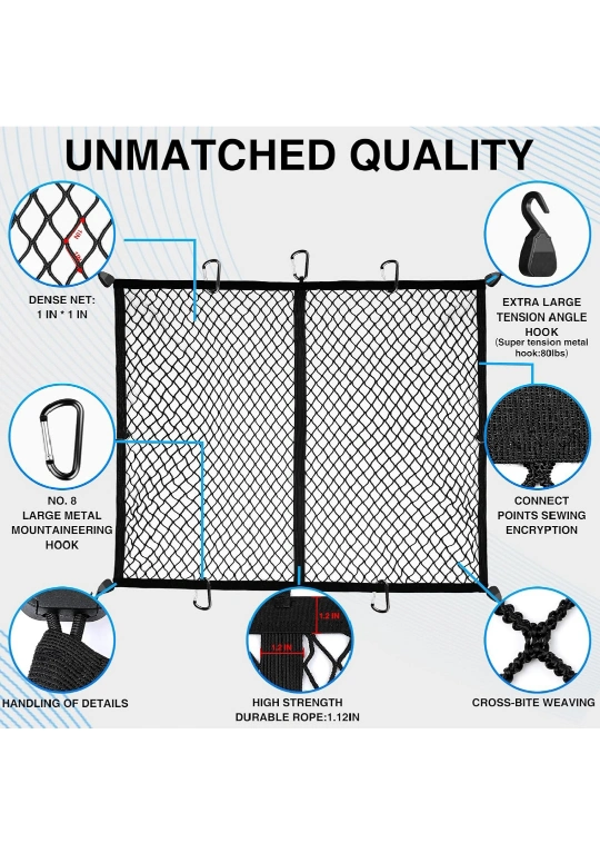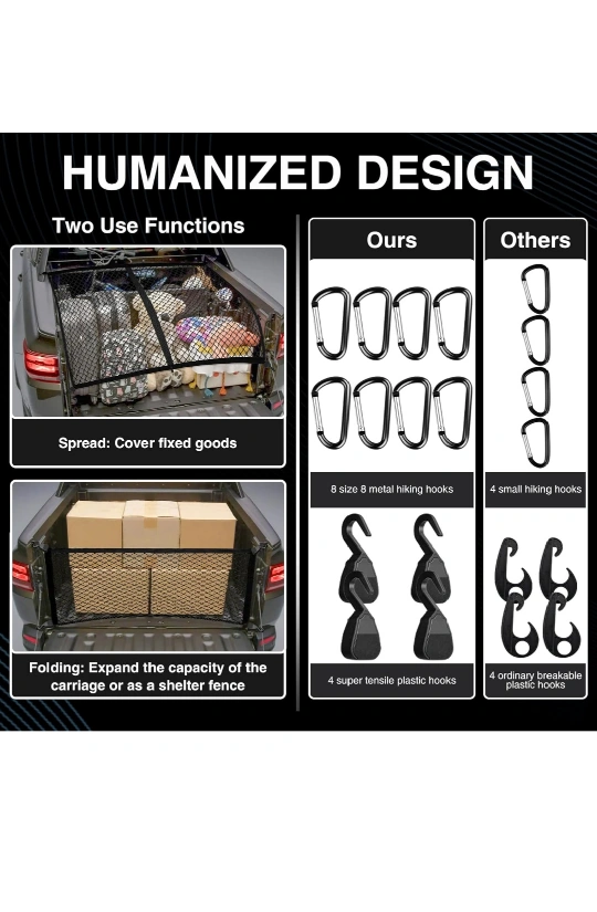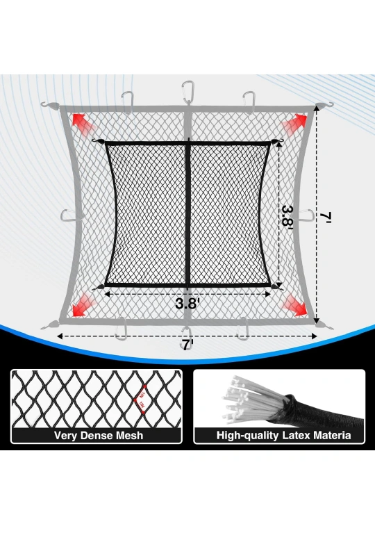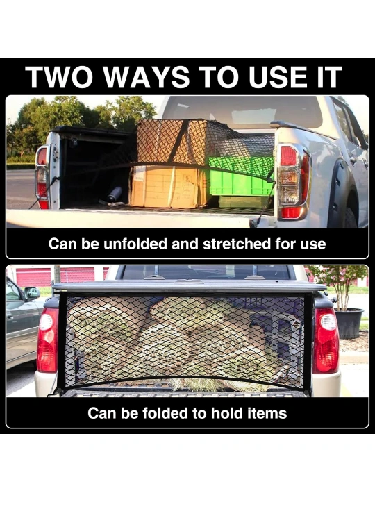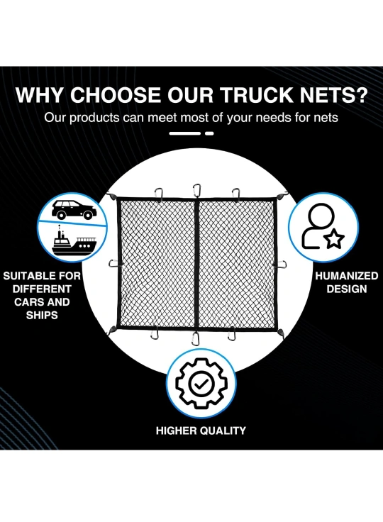 Cargo Net for Pickup Truck Bed - Stretchable 3.8'x3.8' to 7'x7', Dual-Purpose Highly Elastic Cargo Net with 8 Metal Carabiners & 4 Strong Hooks for SUVs, Cars and Trucks, Luggage Storage Net.
