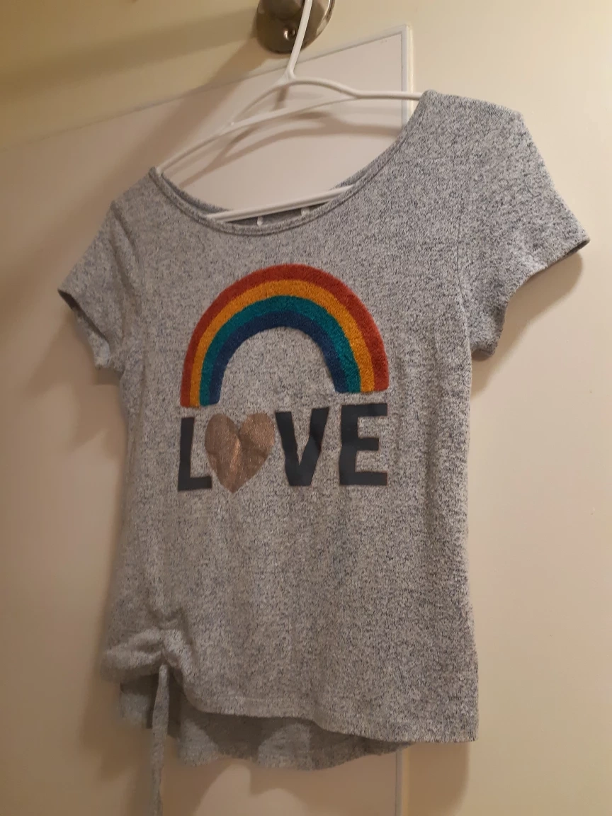 Cute rainbow love t-shirt available for sale for $5! Approximately medium size! Good condition, soft and comfortable fabric! 7786083054 call or text! Main St./Downtown pick-up is fab!