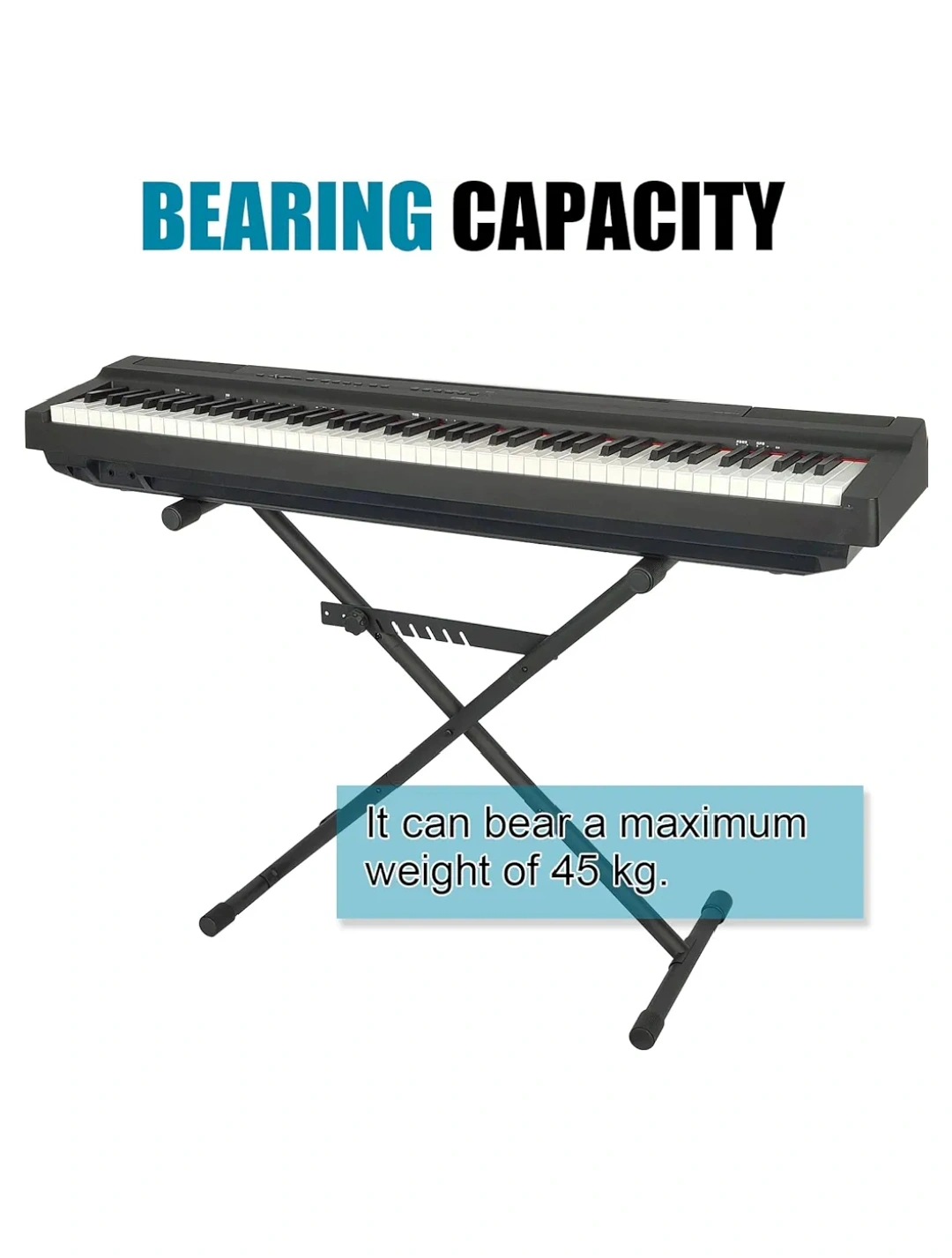 Height adjustable keyboard stand. Seven different heights from 60-97 cm. Rubber feet prevent slippage. Width adjustable to fit 61-88 key keyboards and pianos. Rubber sleeve protects keyboard.GLEAM Keyboard Stand Single-X-Shaped.