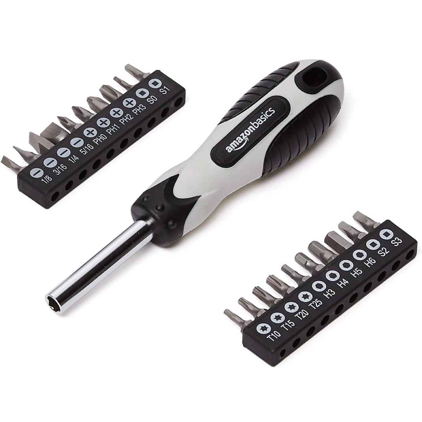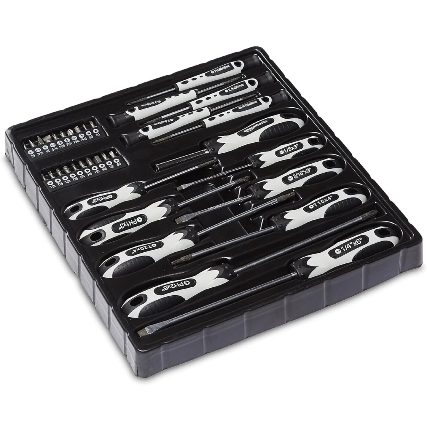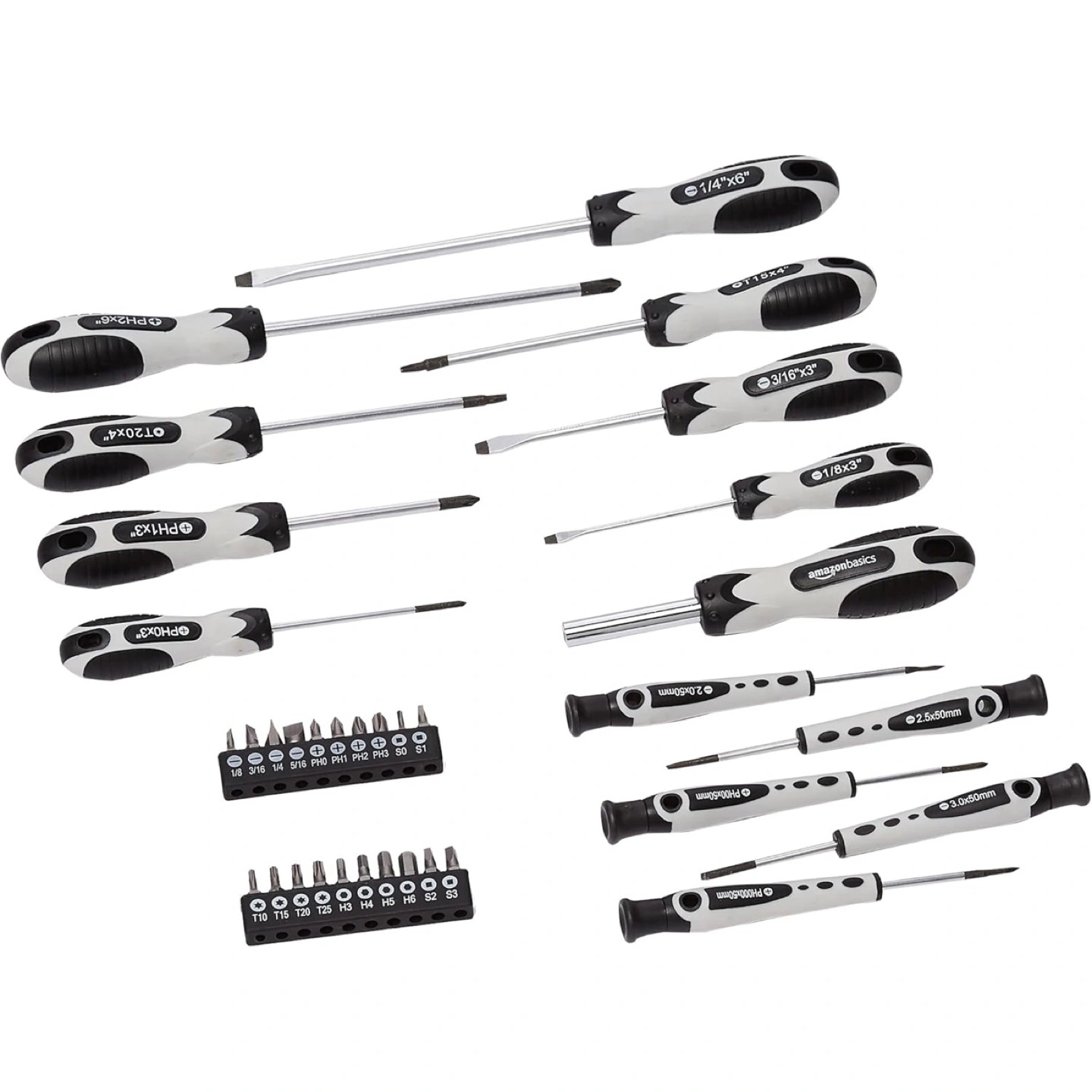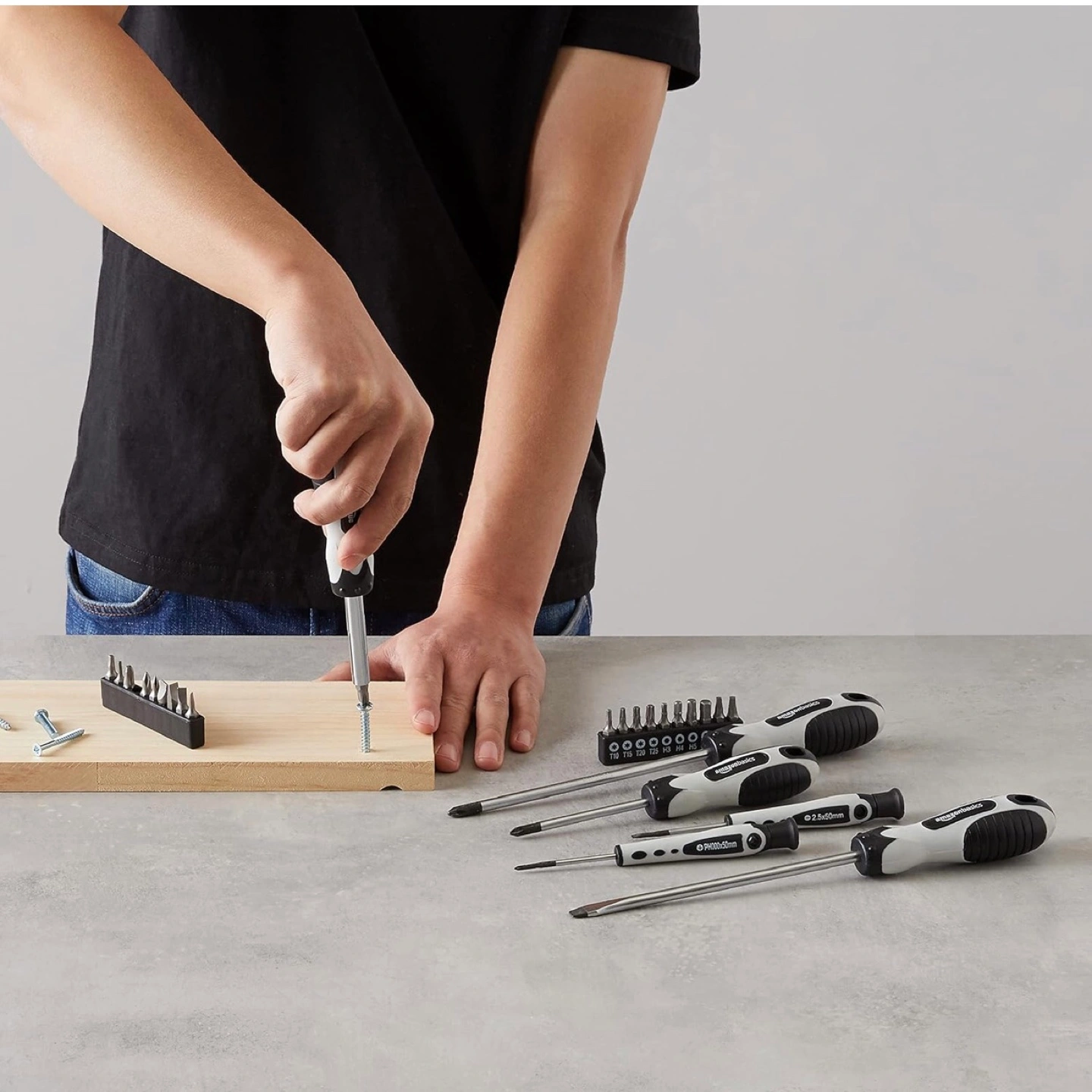 Amazon Basics 34-Piece Magnetic Tip Screwdriver Set - Slotted, Phillips, Star, Grey & Black ❤️ barand new in box ❤️ For more information, please copy the title to google ☺️ No meet,No delivery ,house Pick up only by Coquitlam. Thanks 😊 Cash only price firm ,💡 Not reply for lowball !! still up means available. First come, first serve.No Hold !!! No return or exchange for non defective item。 34-piece screwdriver set for a variety of projects, including washing machines, refrigerators, air conditioners, televisions, stereos. The included 5 precision screwdrivers work well for computer, electronics, watch, and jewelry repairs Includes 8 screwdrivers: SL1/8 x 3", SL3/16 x 3", SL1/4 x 6", PH0 x 3", PH1 x 3", PH2 x 6", T15 x 4", and T20 x 4" Includes 5 precision screwdrivers: SL2.0, SL2.5, SL3.0, PH000, and PH00 x 50mm; 20 pieces 1/4" x 25mm bits (including 10 Slotted, 4 Phillips and 6 Star); and a holder Made of heat-treated CR-V steel with chromium plating for corrosion-resistant and high strength Magnetic black oxide non-slip screwdriver tips attract screws and provide a tight, secure, fastener connection Sturdy, soft-grip handles made of PP and TPR for a comfortable, slip-resistant hold