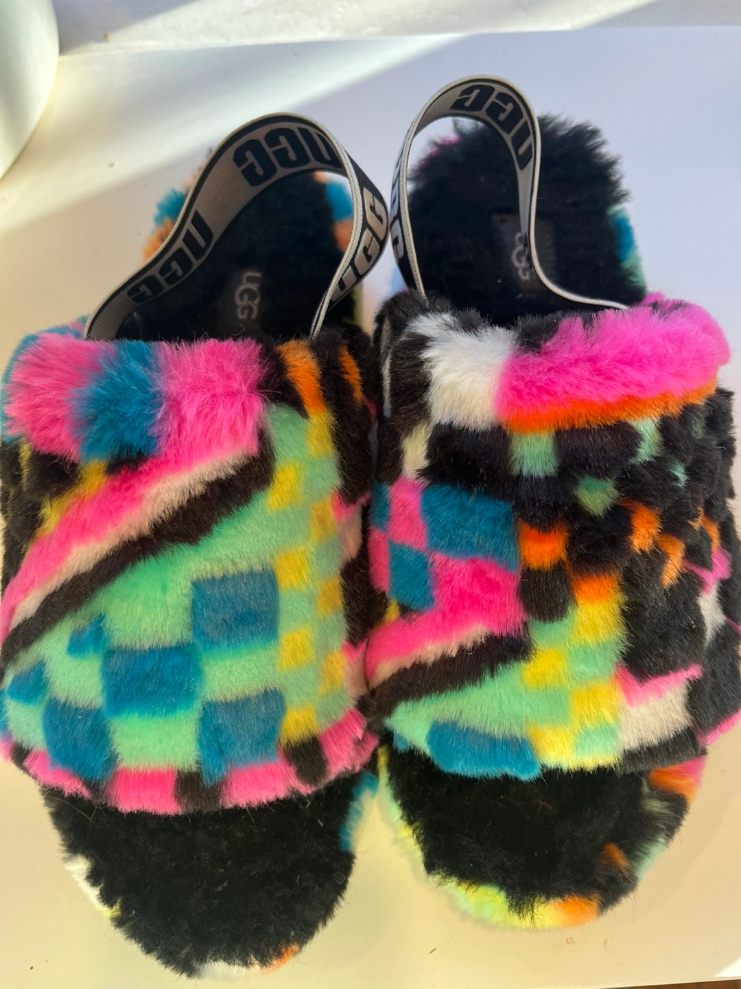 Colorful checkered patterned UGG slides. Features a fluffy upper and comfortable sole. Back strap for extra support. Perfect for lounging around the house. Daughter wore them twice indoors before outgrowing. Really like new.