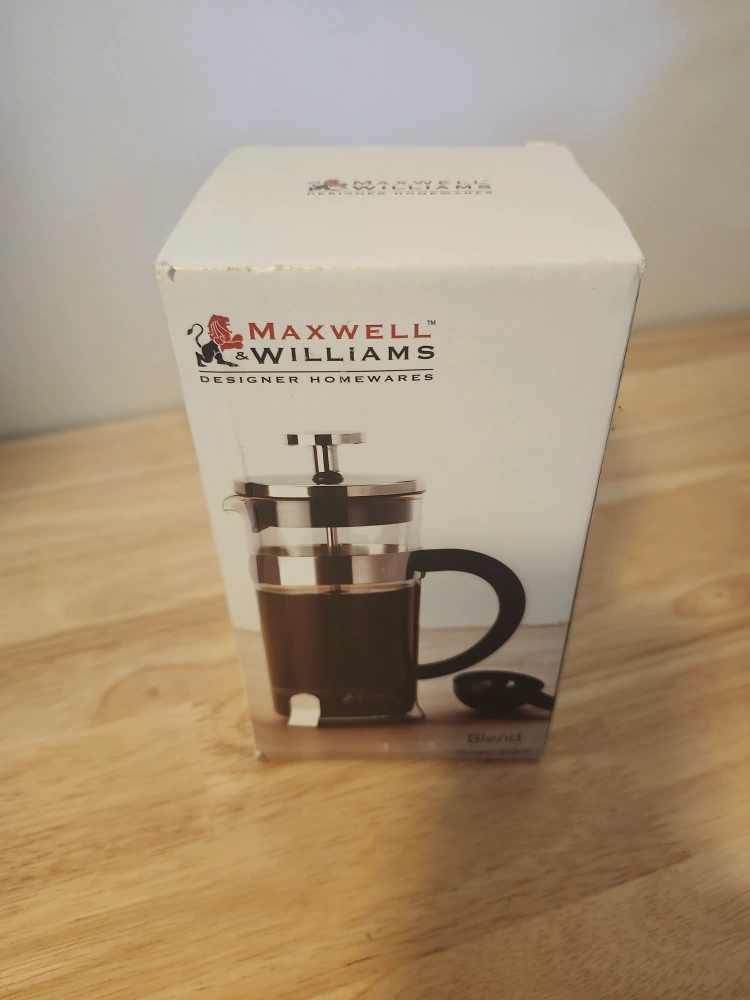 New in box Maxwell & Williams designer homewares French press. Glass carafe, black handle. Includes a small spoon. Stainless ans dishwasher safe.