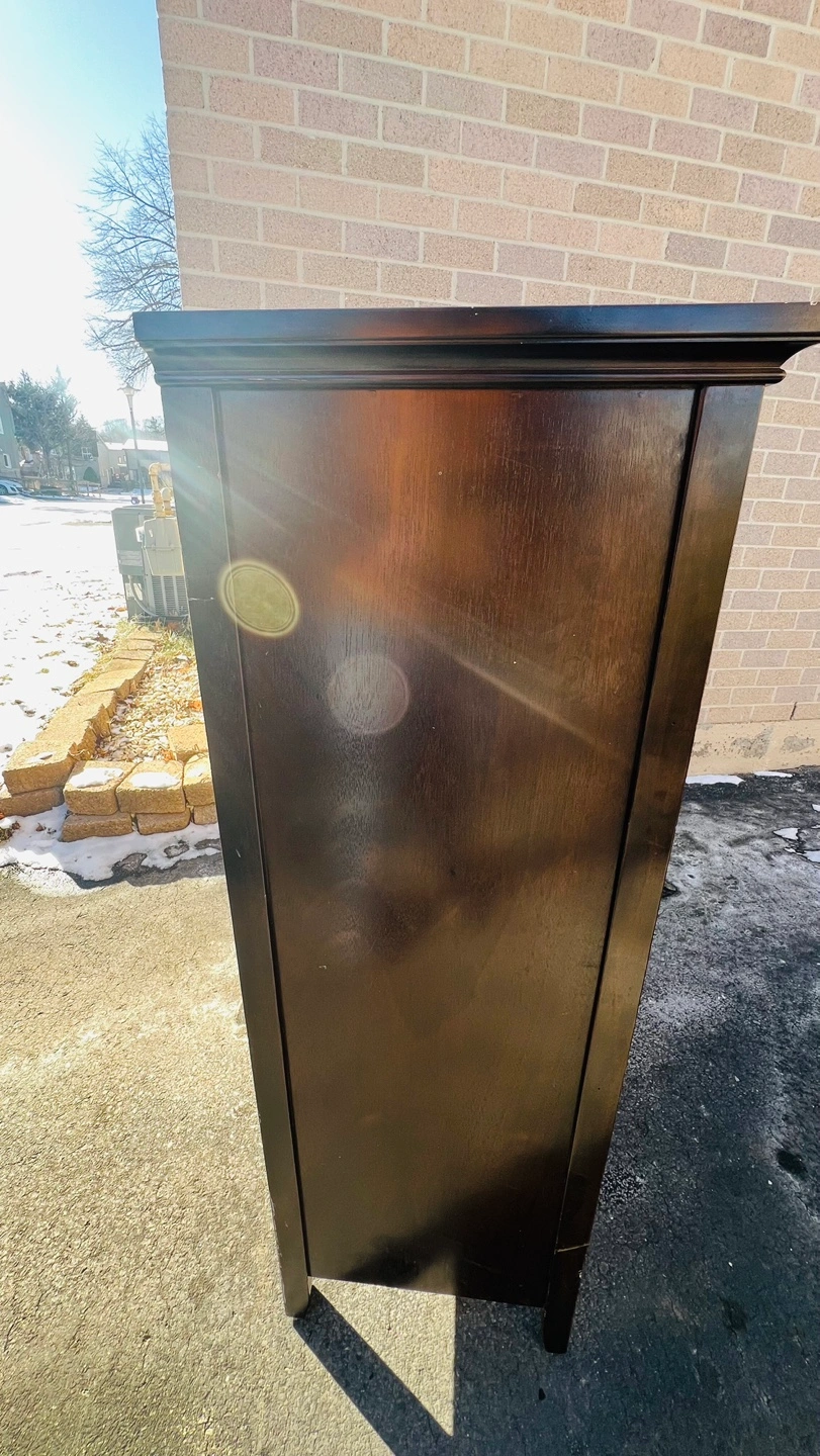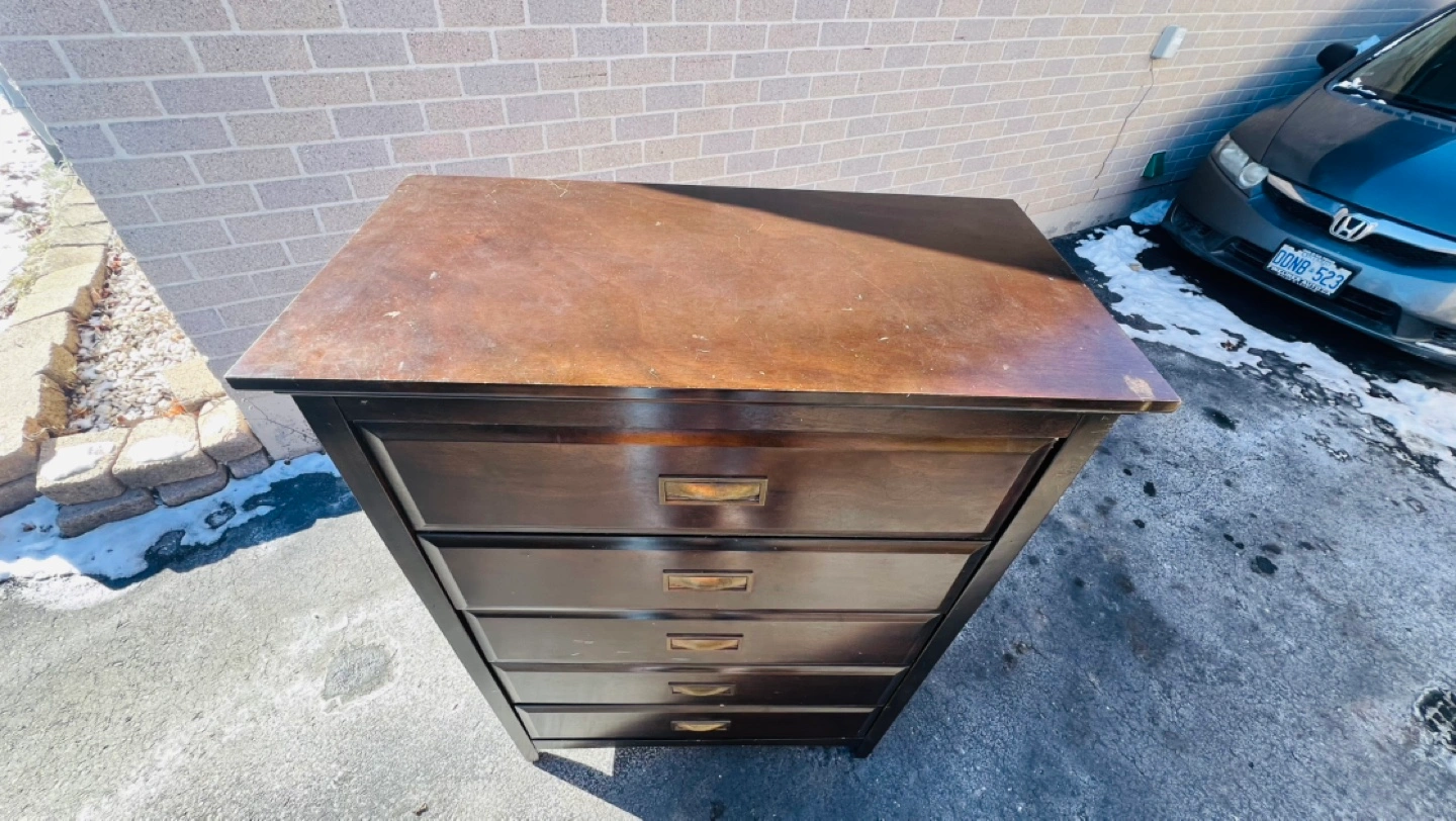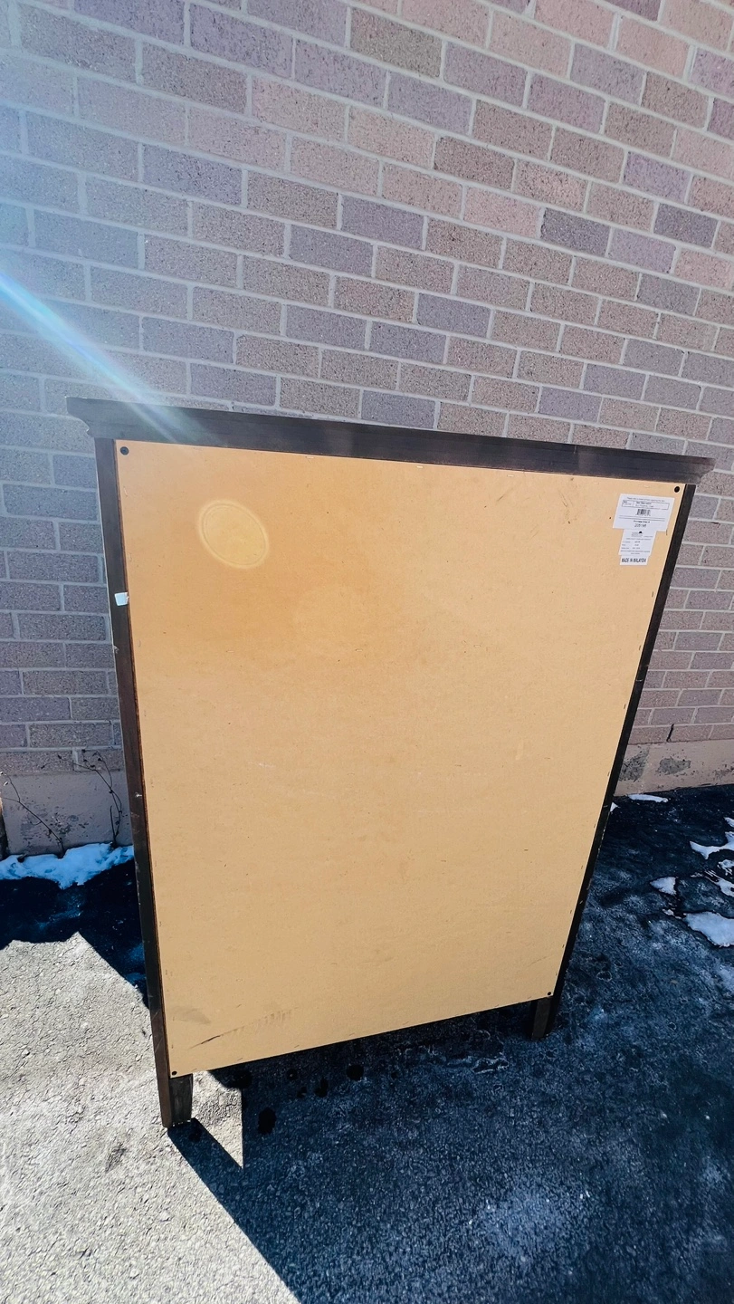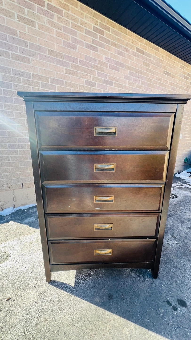 Five-drawer dresser, dark brown wood finish. Brass-coloured drawer pulls. Solid wood construction. Some minor surface wear. Can be used as kitchen utensils stuff holder, clothing, in backyard and garage uses, equipment store and other general uses. Delivery available as per the location. Size: 55H * 36L * 16B (approx)