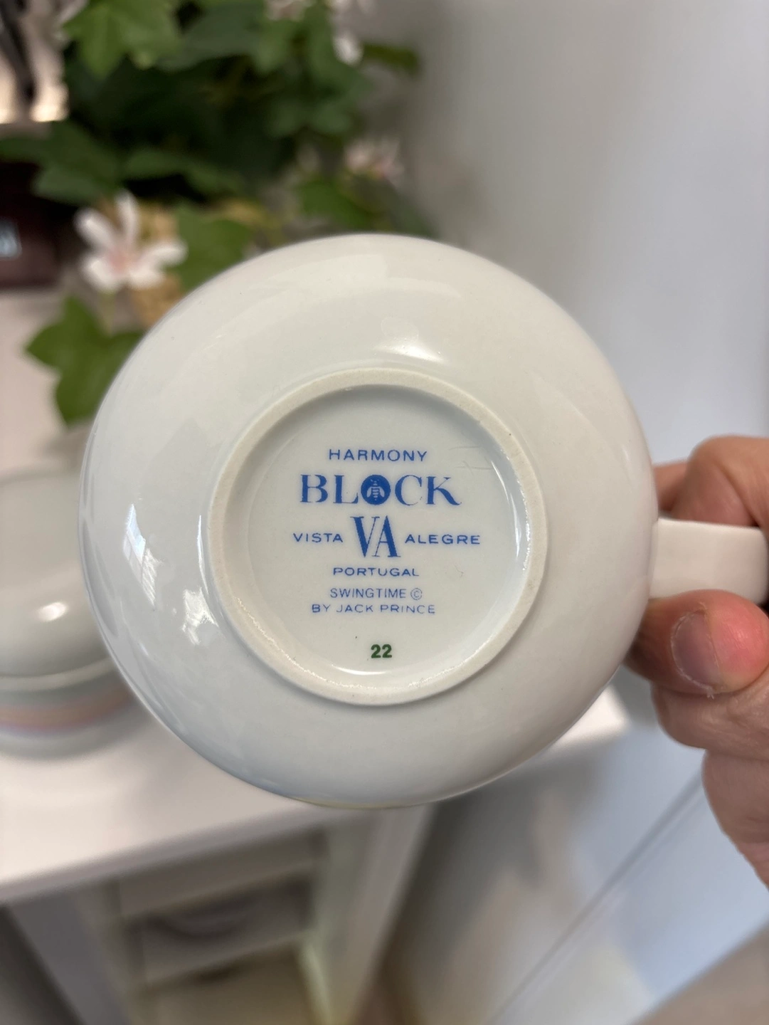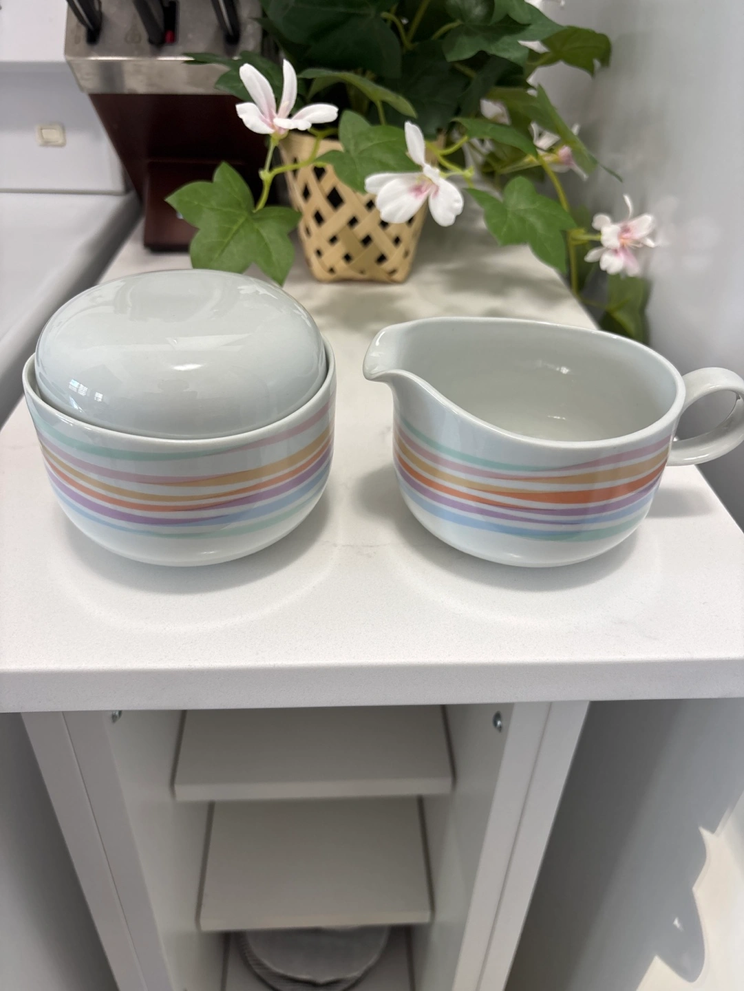Pastel coloured sugar bowl and creamer set. Made in Portugal. Features horizontal stripes.