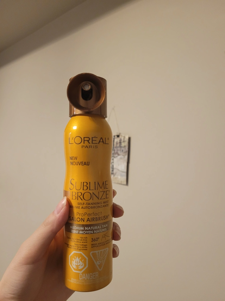 Medium natural tan. Salon airbrush. No rub. 360° wide angle applicator. Quick-drying. Streak-free. Citrus scent.