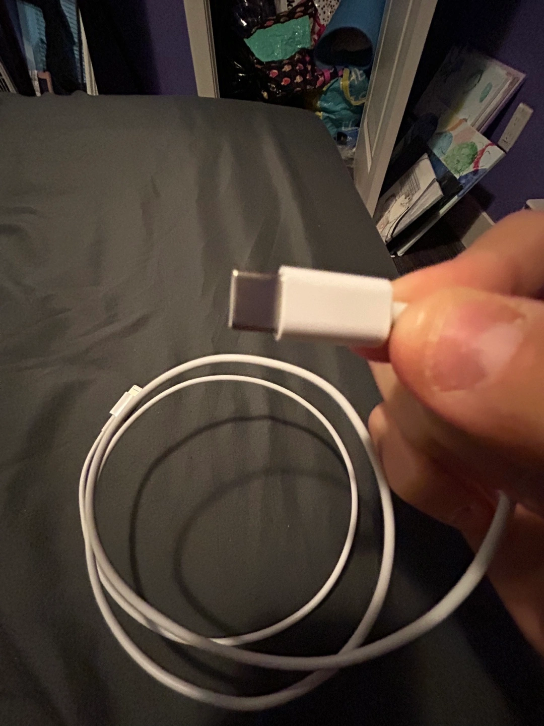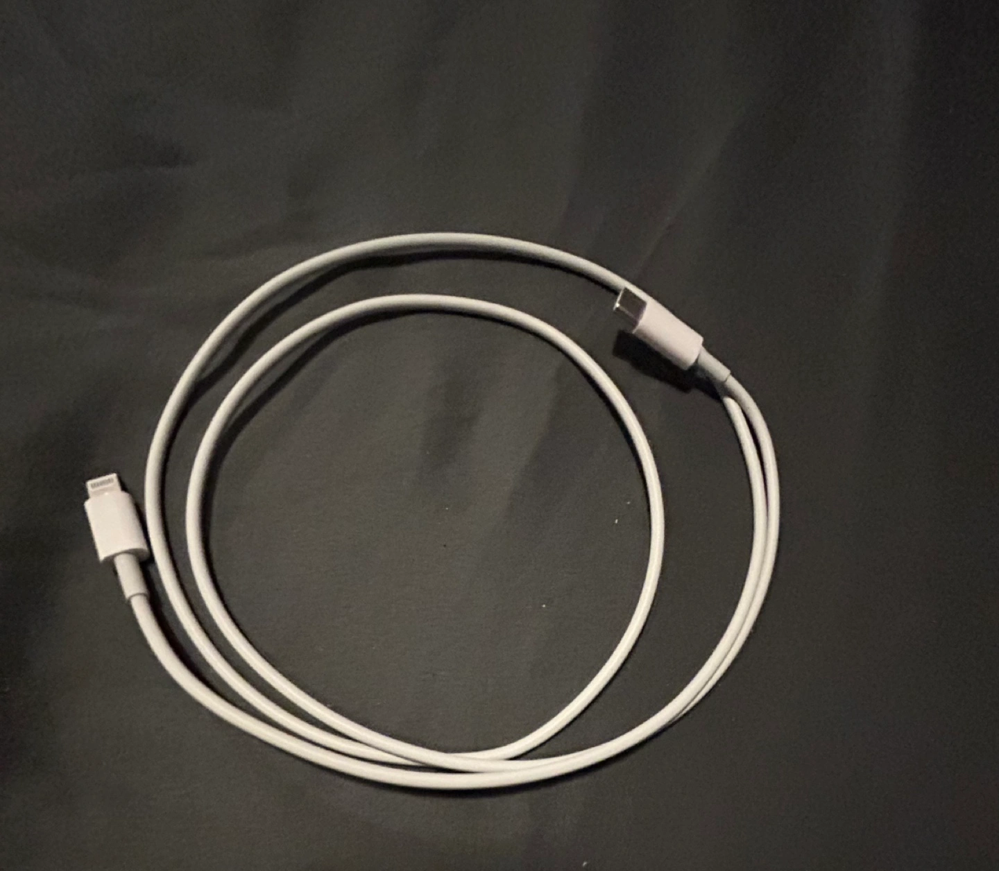 White USB-C to Lightning cable. Good condition. Charges and syncs data. 3.3 feet long. Sold as is. Sorry no refunds. Cash or e-transfer only. Payment to be made at time of pick up.,