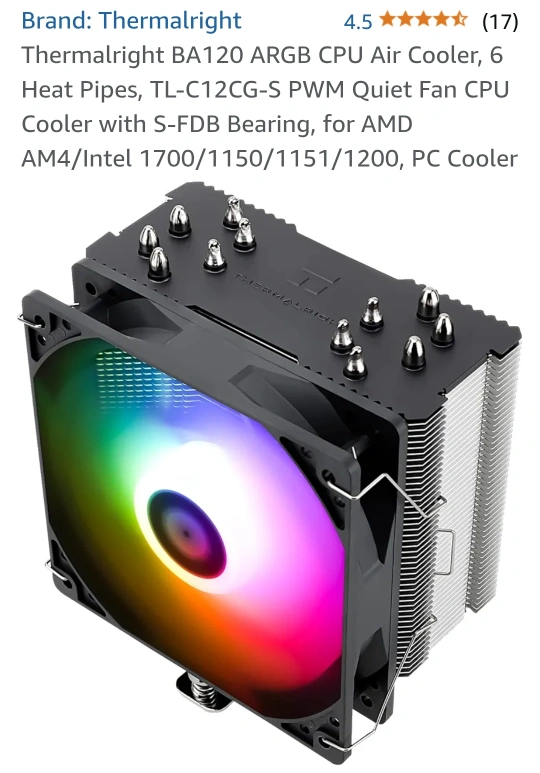 Thermalright BA120 ARGB CPU air cooler. Six heat pipes. Quiet fan. S-FDB bearing. Compatible with AMD AM4/Intel 1700/1150/1151/1200. Includes mounting hardware and thermal paste. pick up only and cash price firm