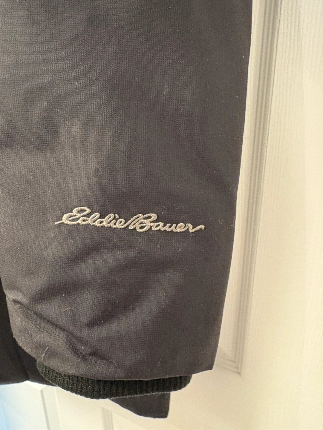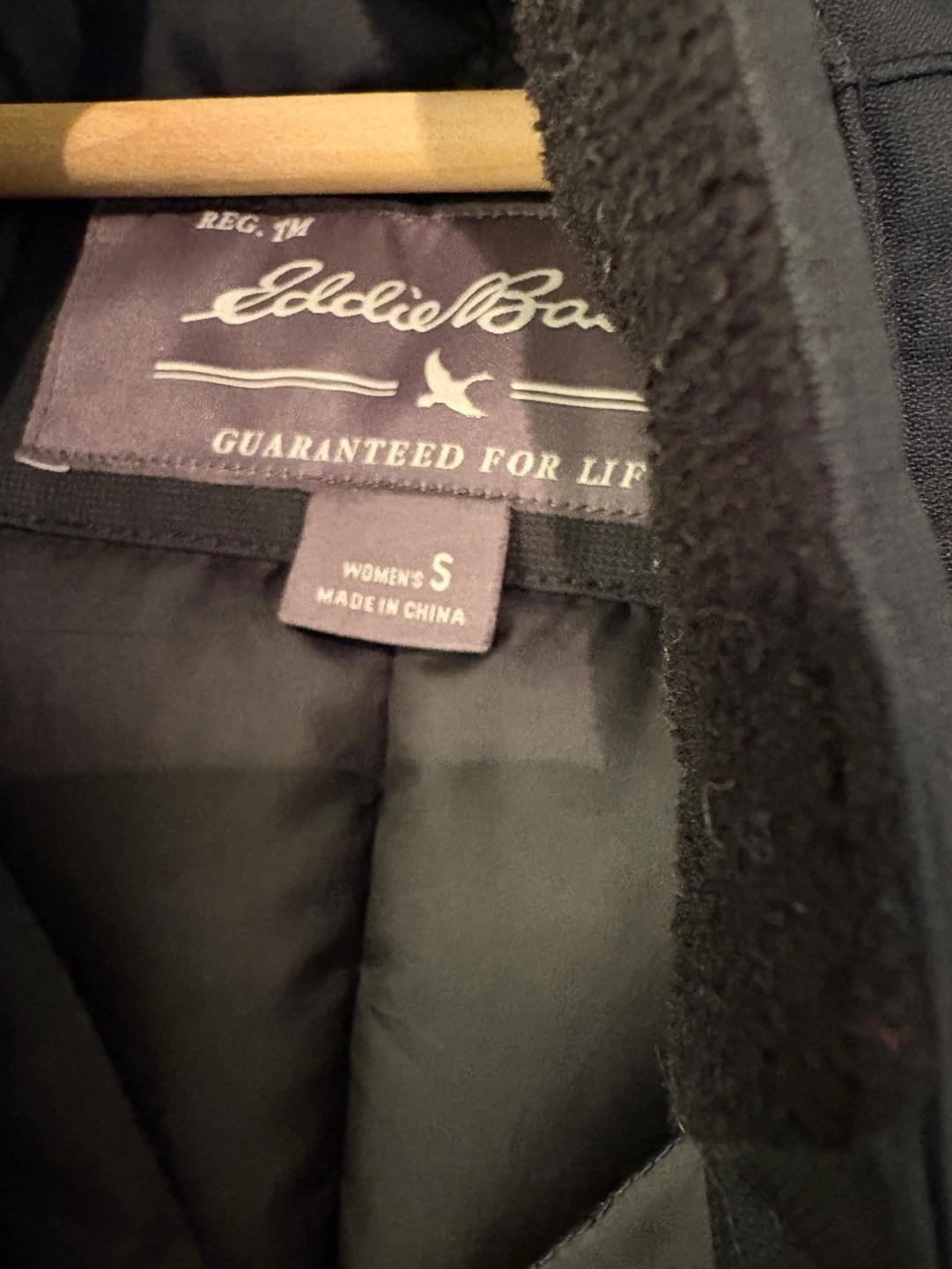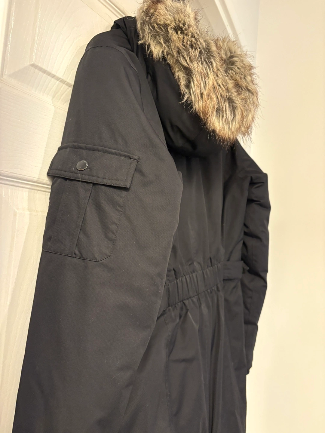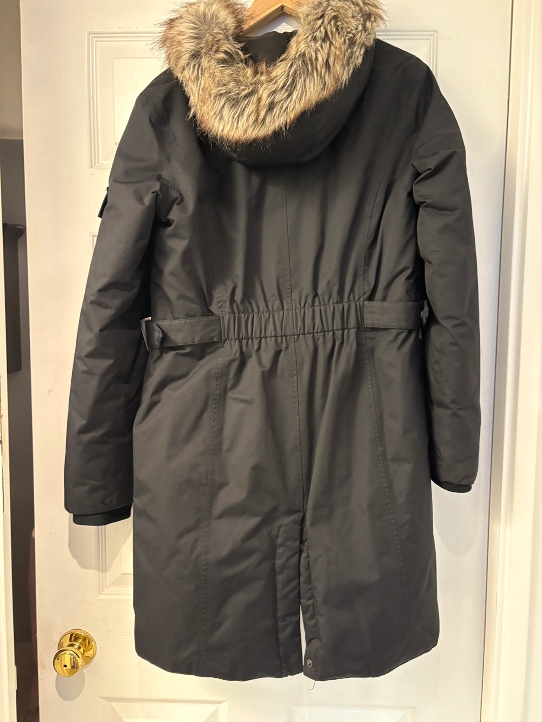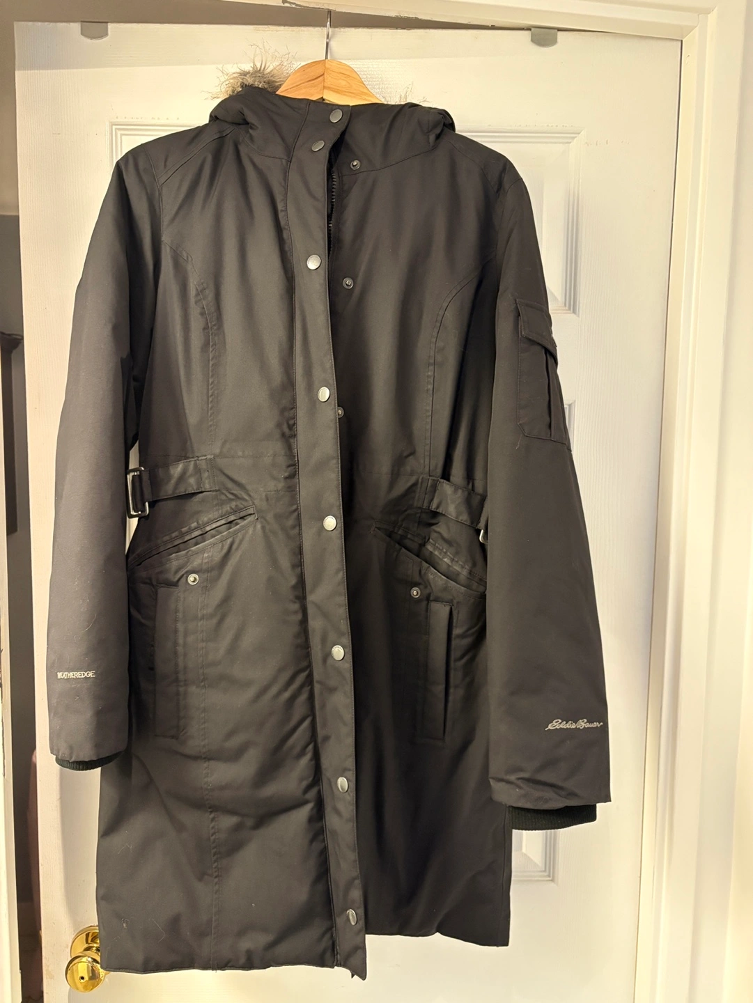 Women's Eddie Bauer parka. Size small. Black colour. Long length. Fur-trimmed hood. Multiple pockets. Drawstring waist. Guaranteed for life. used it for 2 seasons