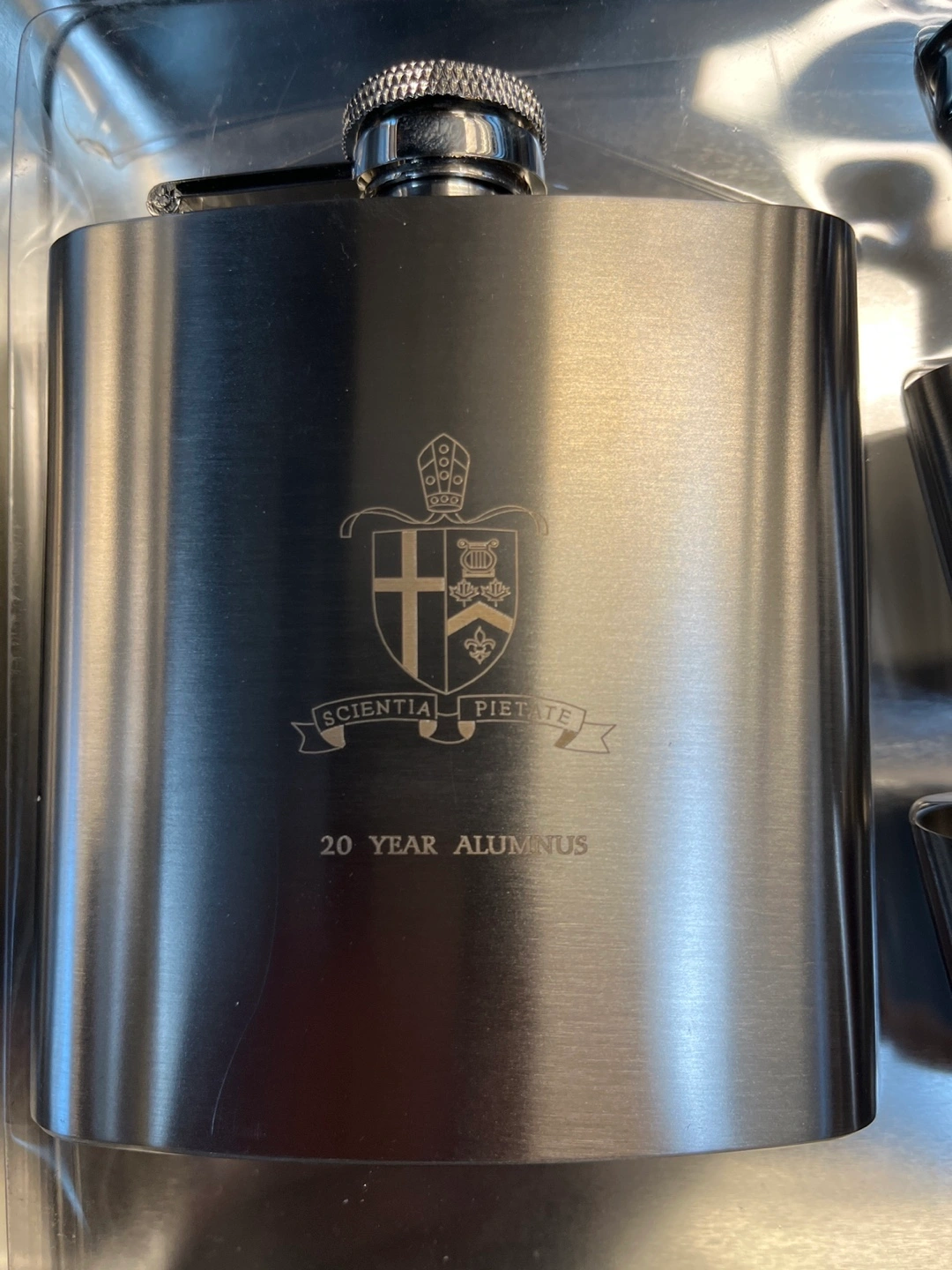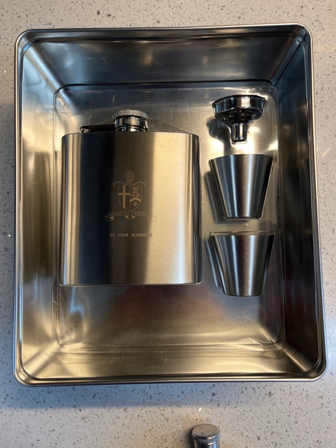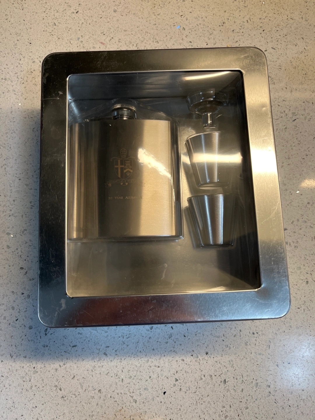 Stainless steel hip flask set. Includes flask, funnel, and two shot glasses. Engraved with 20 Year Alumnus crest and date. Comes in a metal gift box. Will throw in additional 5oz flask You can pick up by Carlton and Jarvis area Serious enquiries only please. Too many people wasting my time and low balling and not following up.