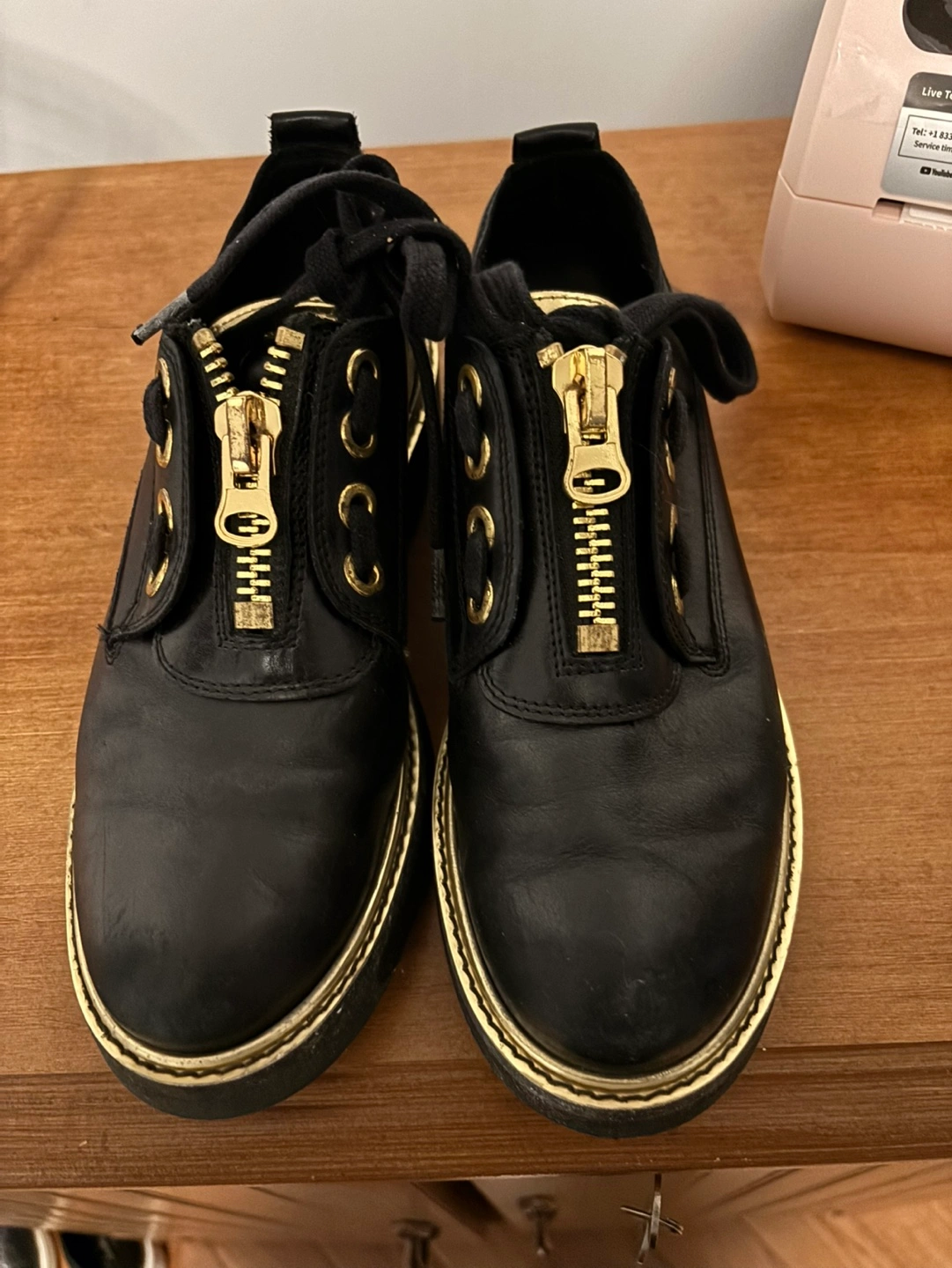 Women's black leather oxfords. Features gold zippers and accents. Platform sole. Lace-up closure. Size 36. 5.5. Minor scuff on toes but mostly Like new condition