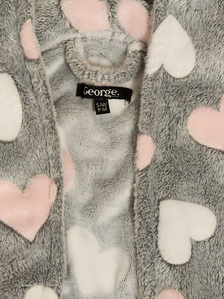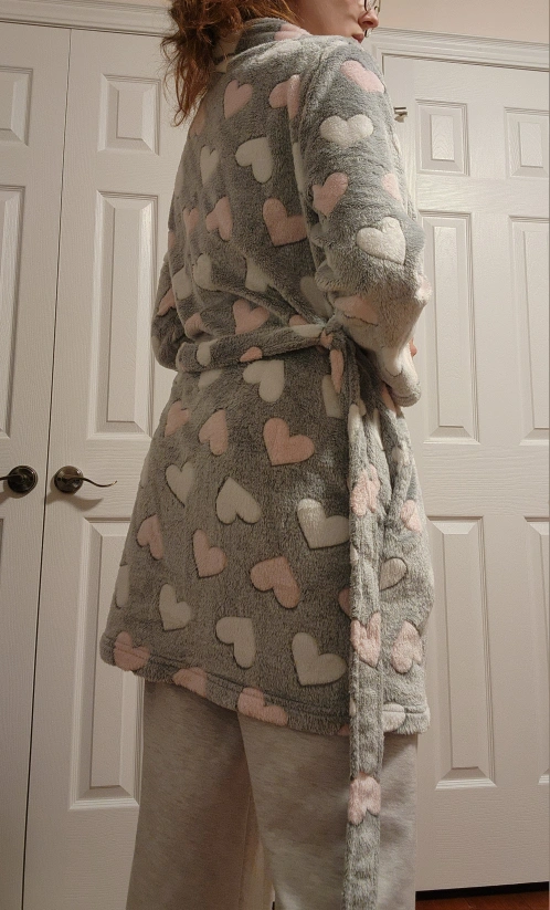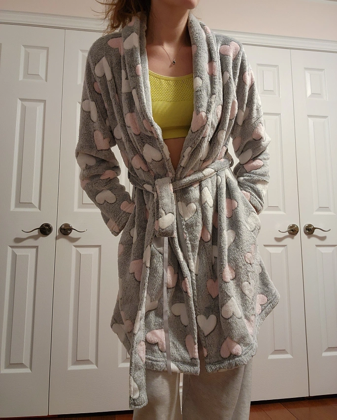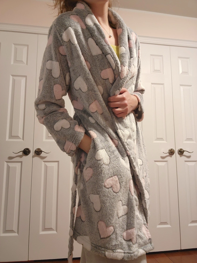 The cutest and softest house robe with a heart design and a belt. She's basically brand new and the plastic loop from the tag is still on the inner fabric tag. She's a size S/M. I typically wear medium for long sleeved items. Pick up at Sheppard West subway station and cash only please :)