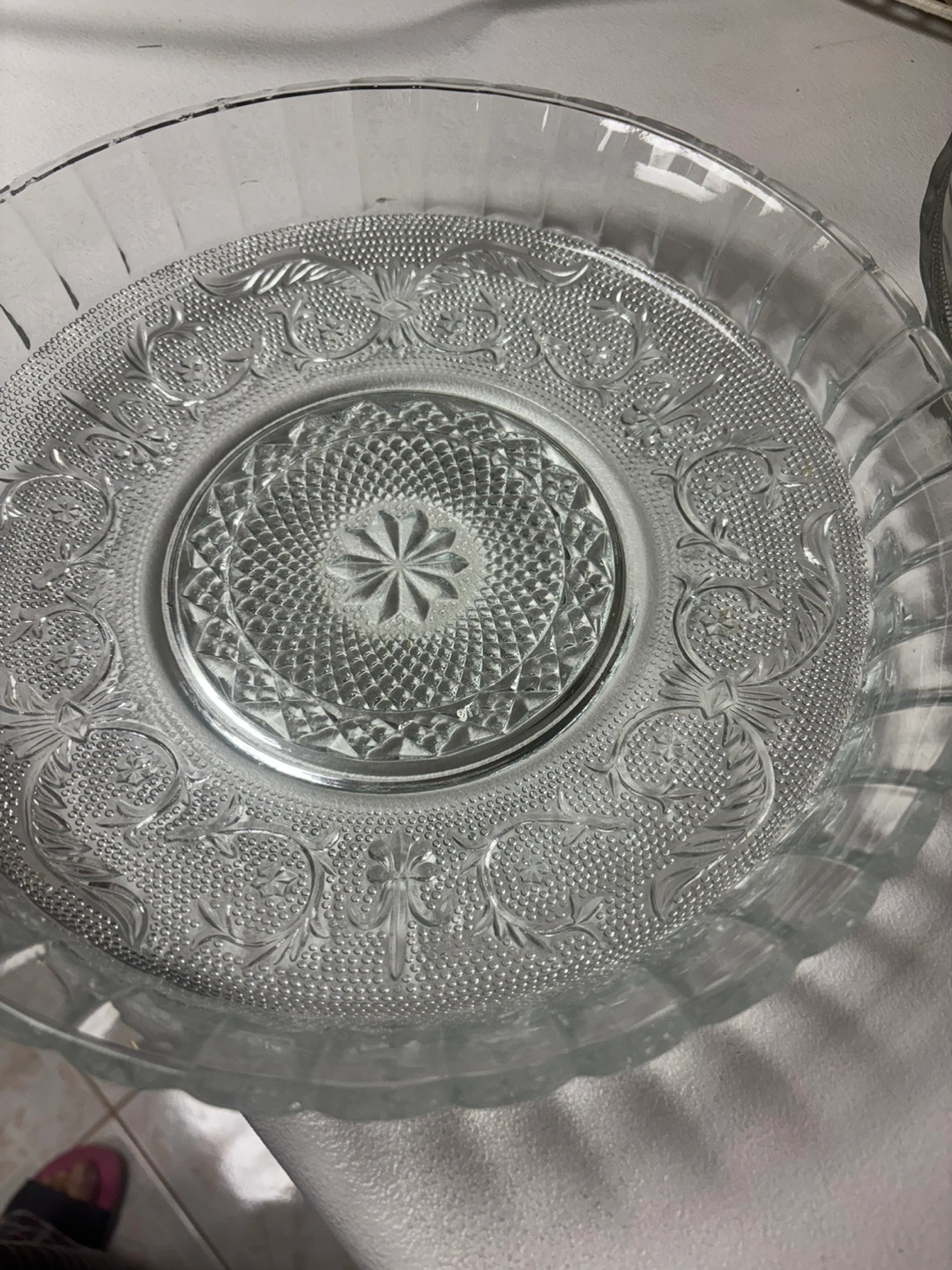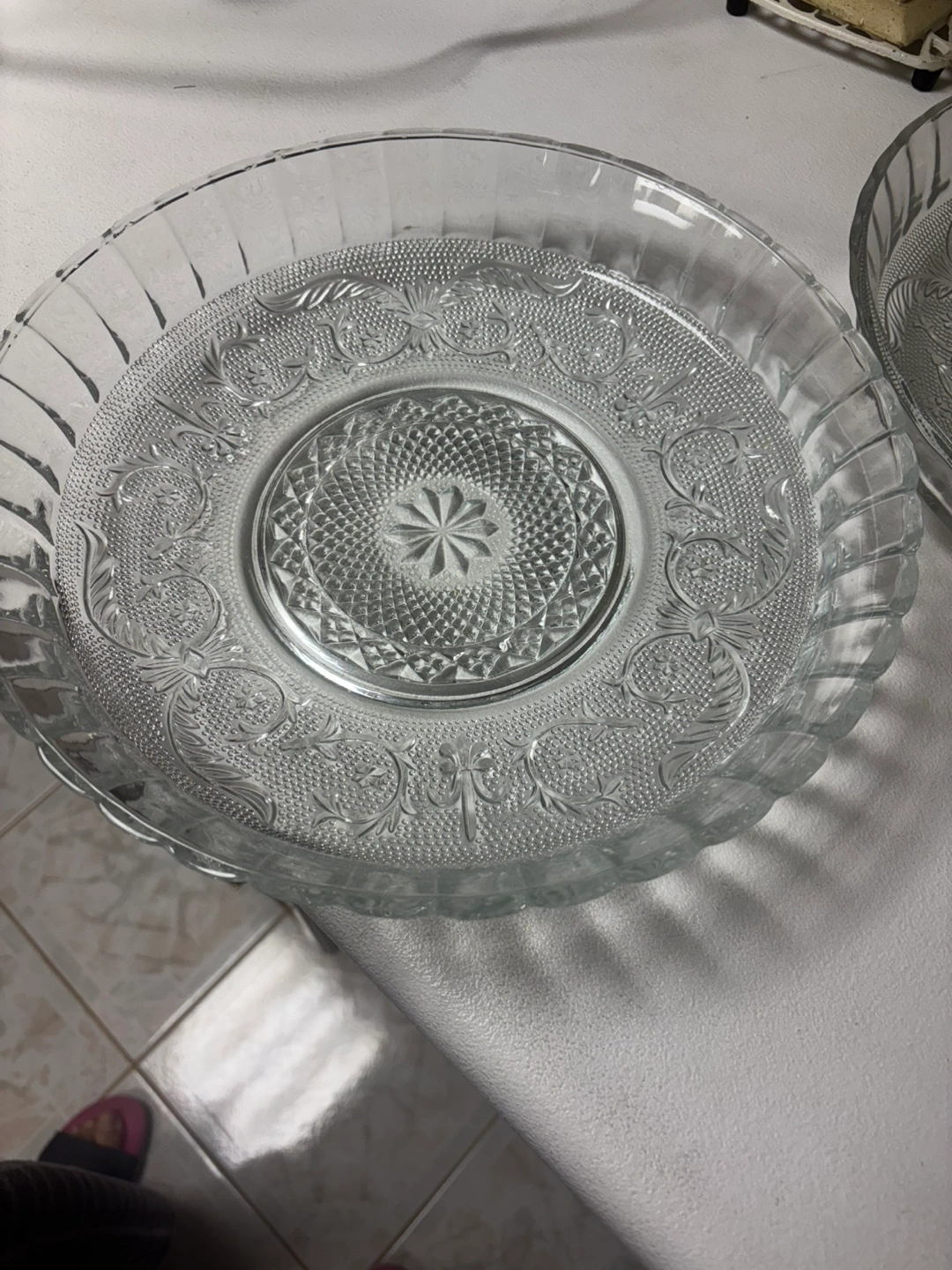 vintage glass serving dishes. Clear glass with an etched floral pattern. Perfect for snacks or desserts.