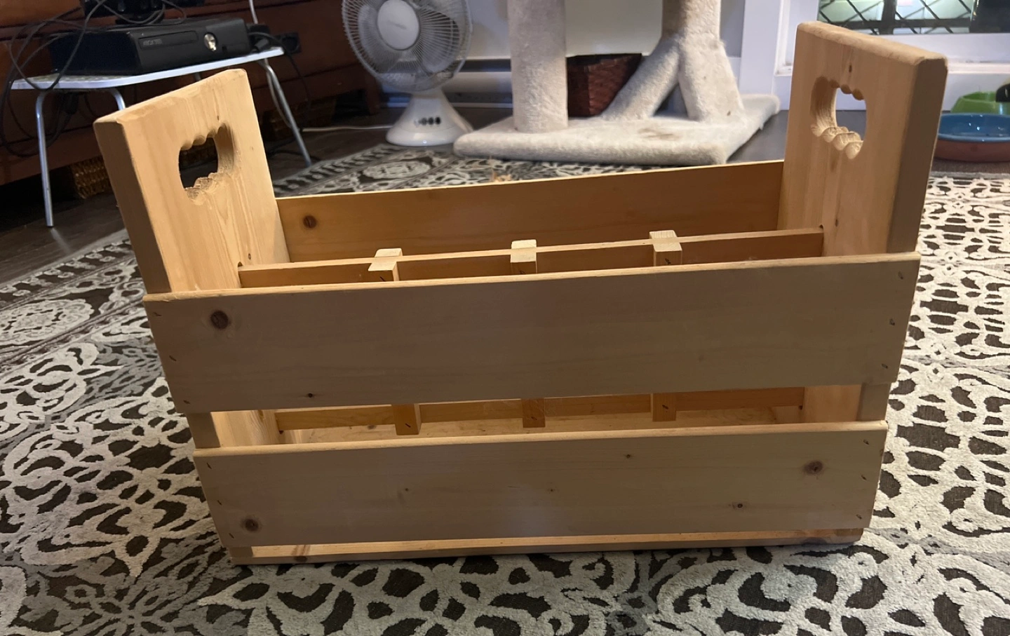 Medium sized wooden wine crate. Features two carrying handles. Interior dividers. Handcrafted by Norm Libby Very sturdy, room for 8! 🎉