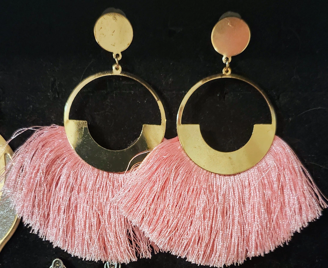 Gold-tone statement earrings. Pink tassel accents. Lightweight and stylish.