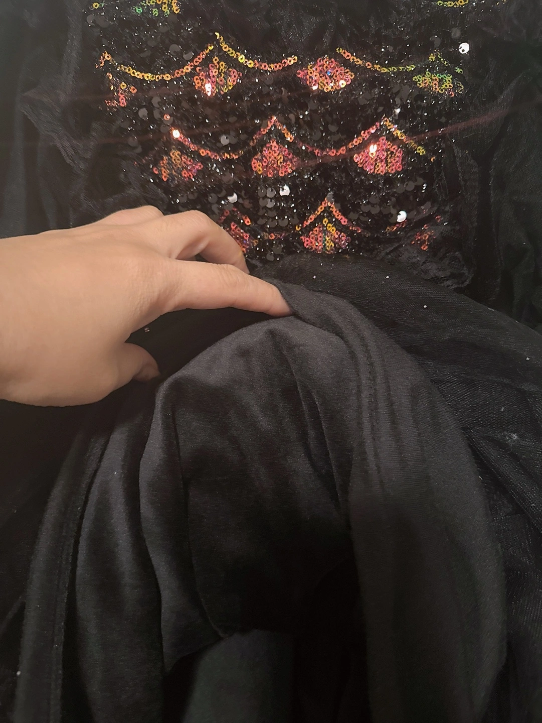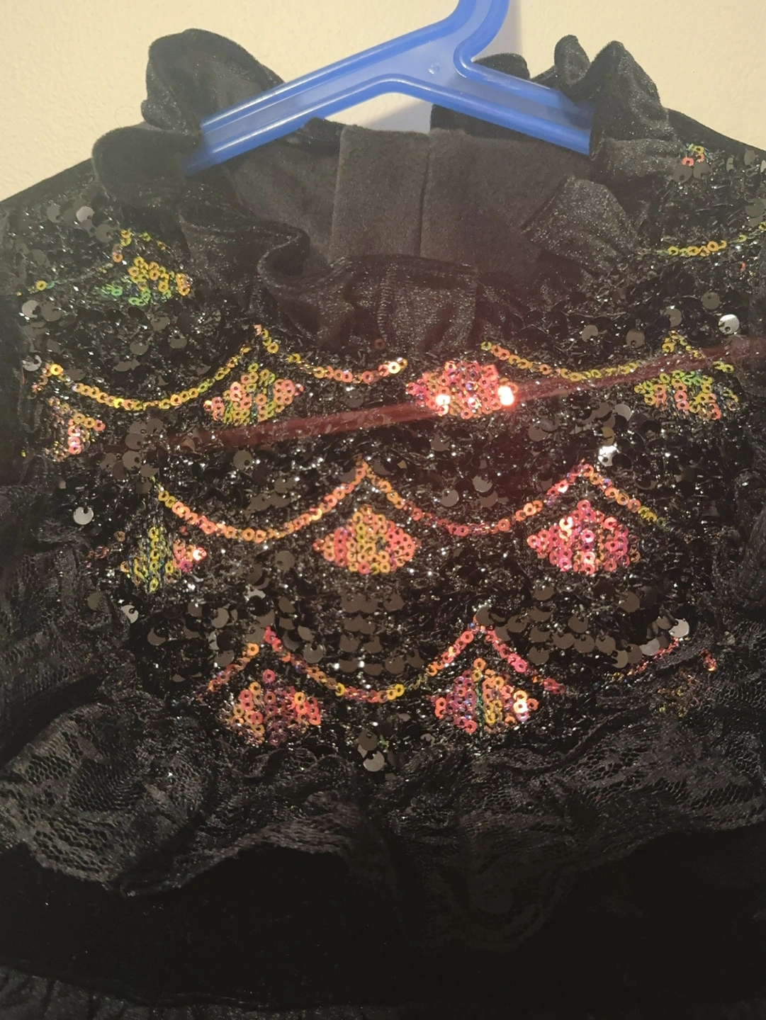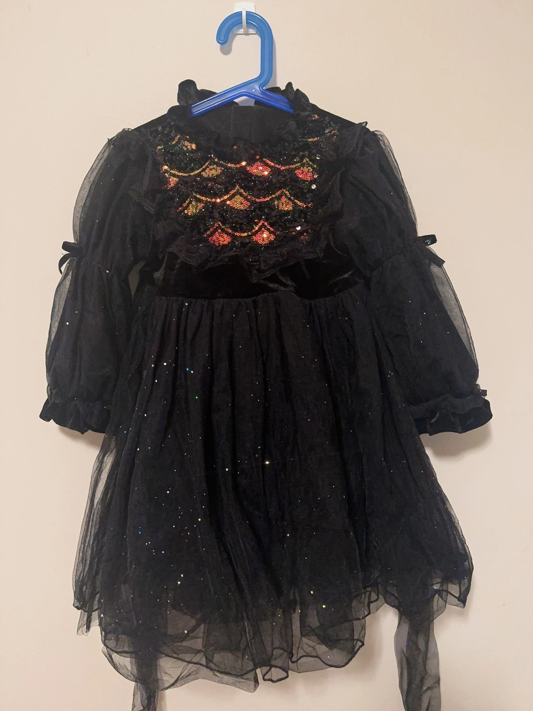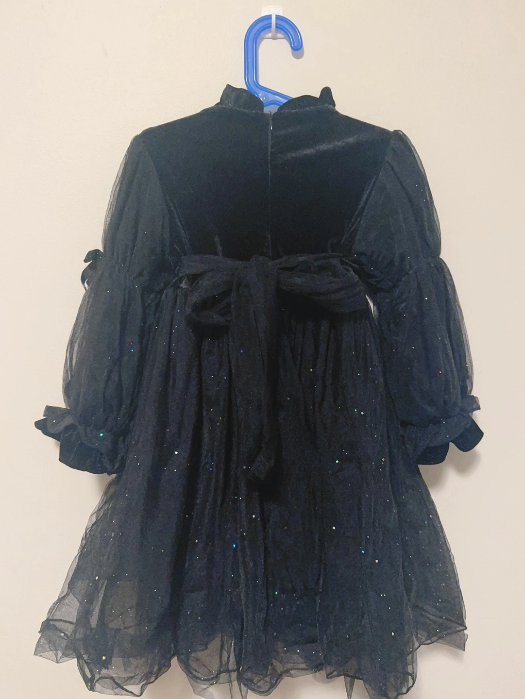 Adorable black dress. Features velvet bodice, tulle skirt, and sequin embellishments. Long sleeves. Size not specified. Toddler size 4/5t