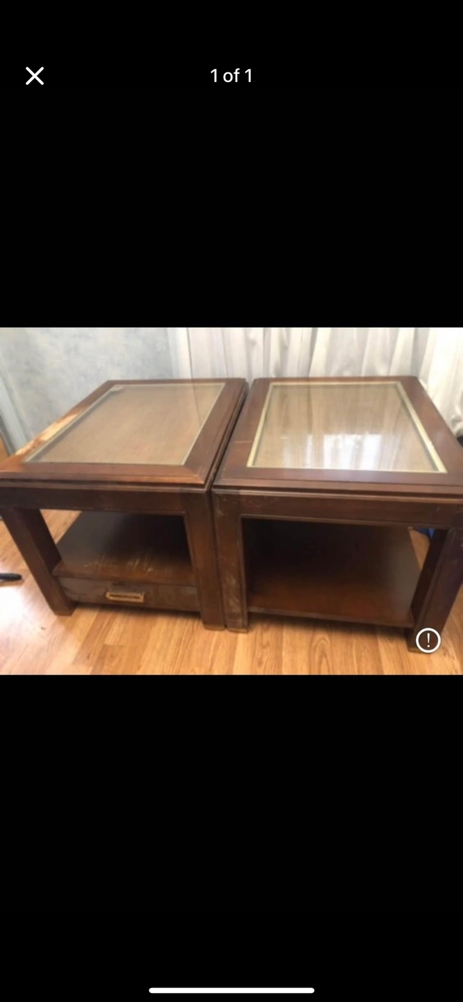 Two matching end tables. Dark brown wood finish. Glass tops. One table features a small drawer. Great refinish project as they have some blemishes. Nice and sturdy! 63cm/56cm (approximately 24x22 inches) each
