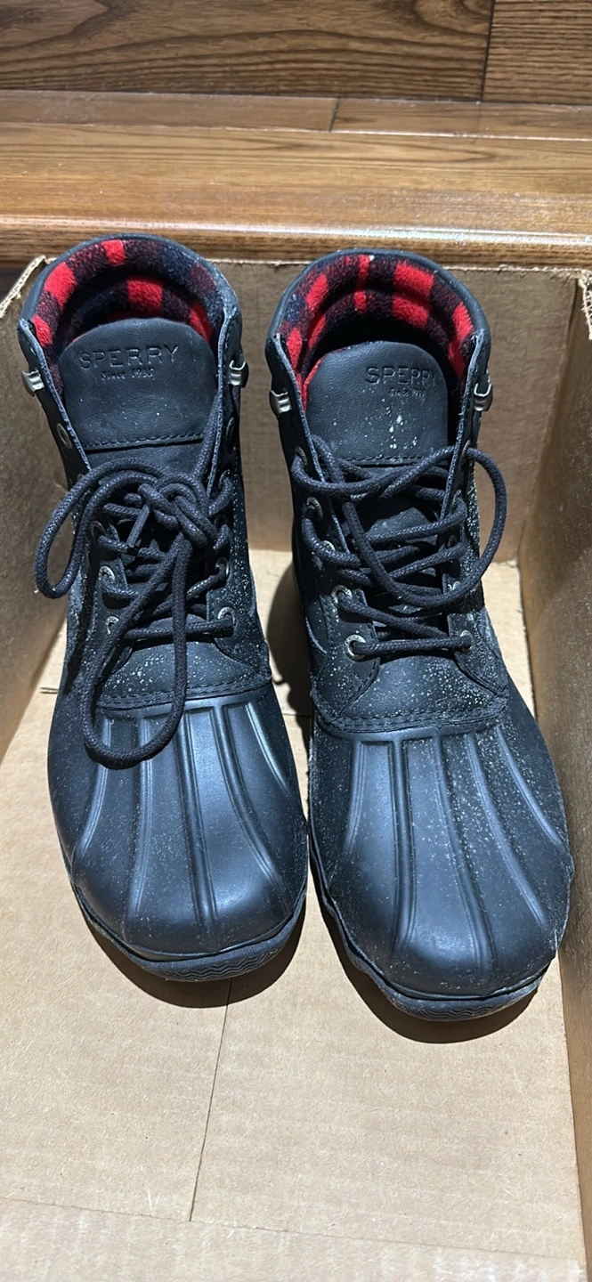 Mens black duck boots. Lace-up style. Red and black plaid inner lining. Good condition. With only a couple of times but need a good cleaning after storing