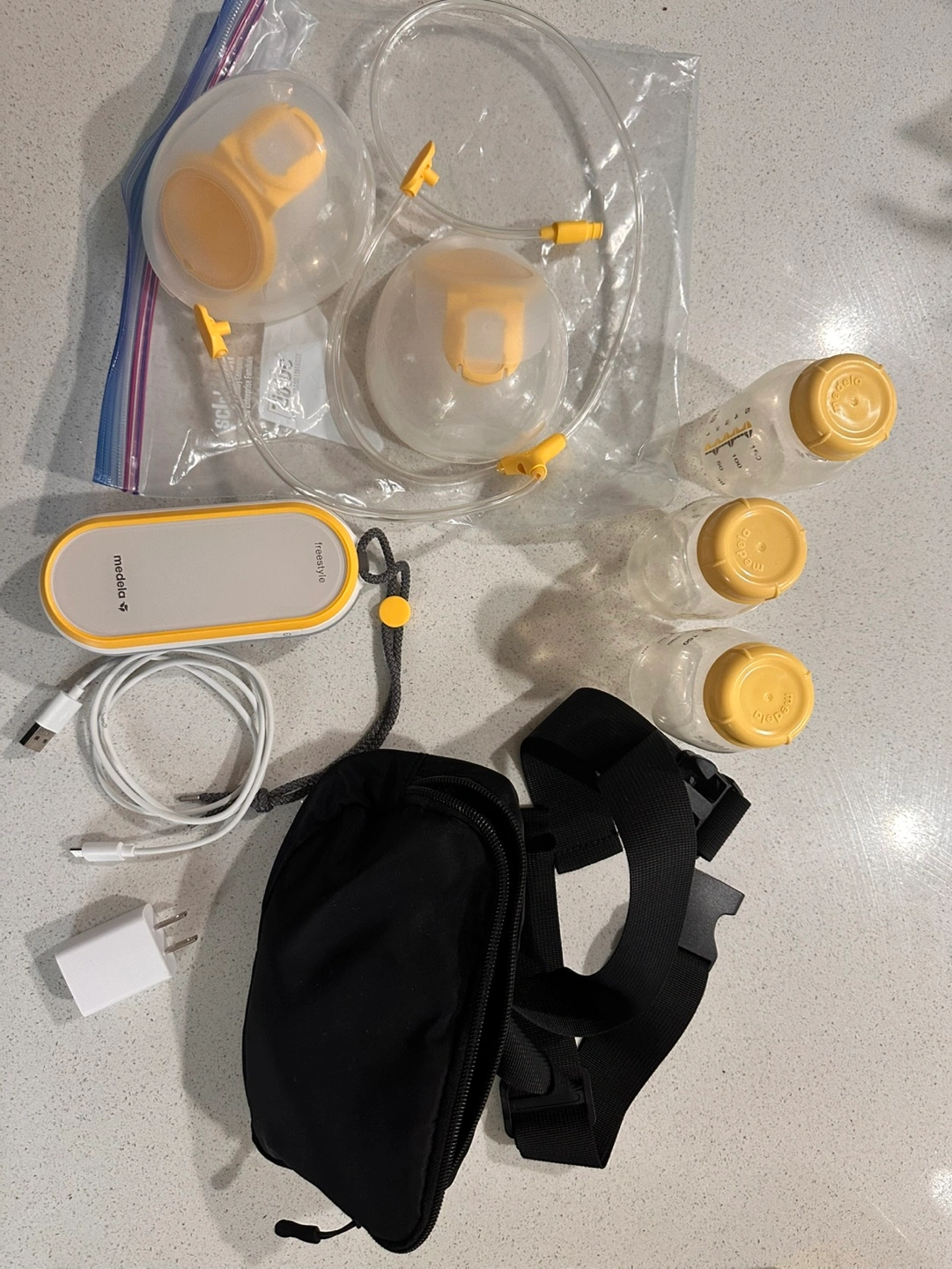 Portable double electric breast pump. Includes two breast shields, bottles, carrying case and charger. Gently used. Comes with bottles and fanny pack