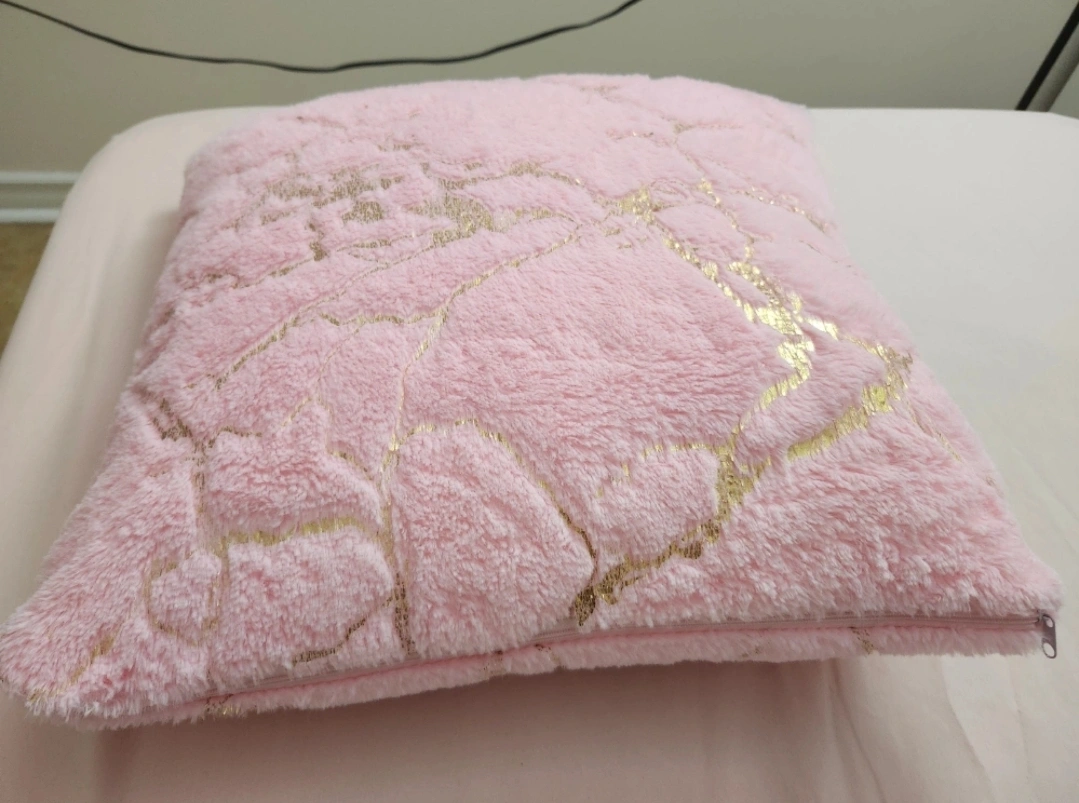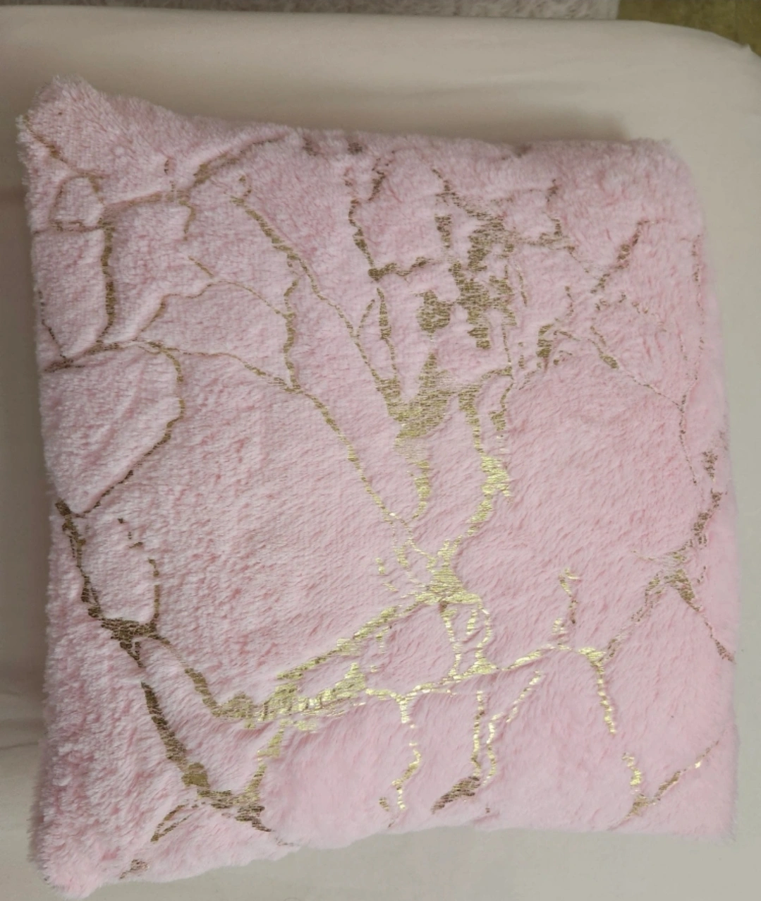 Soft pink plush pillow. Gold marble design. Zipper closure. Great for adding a touch of elegance to your home decor.