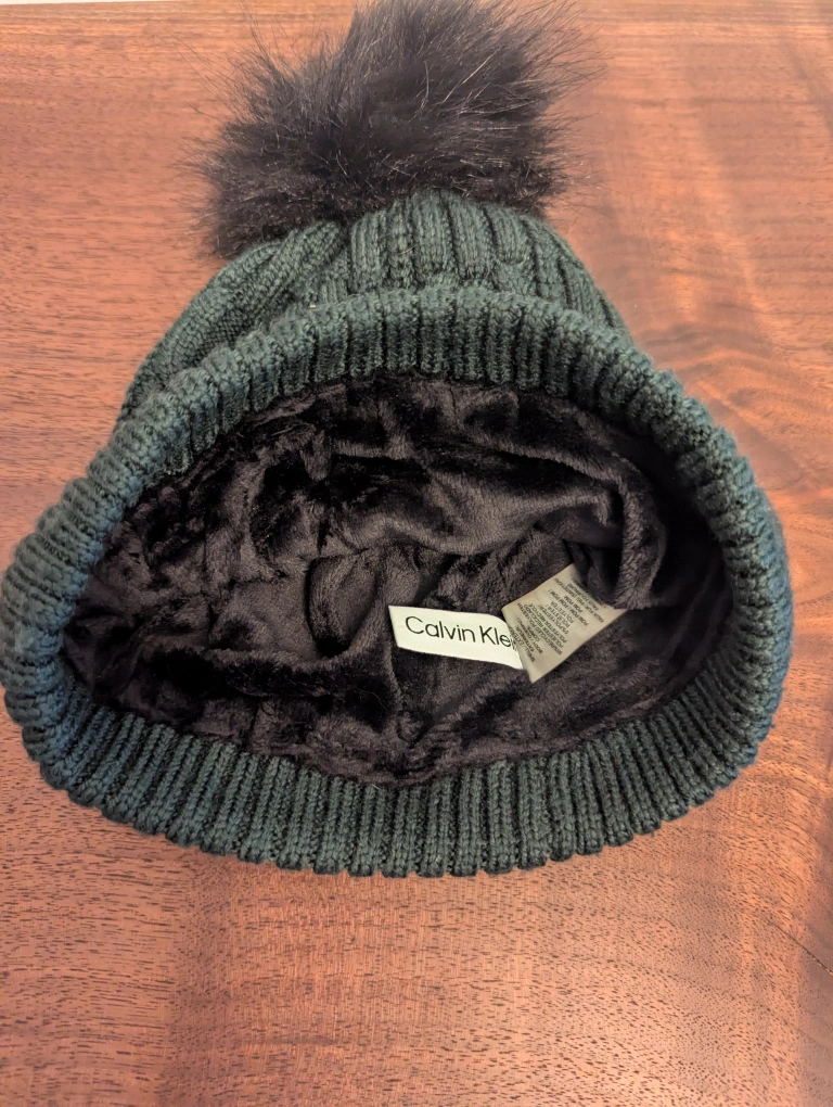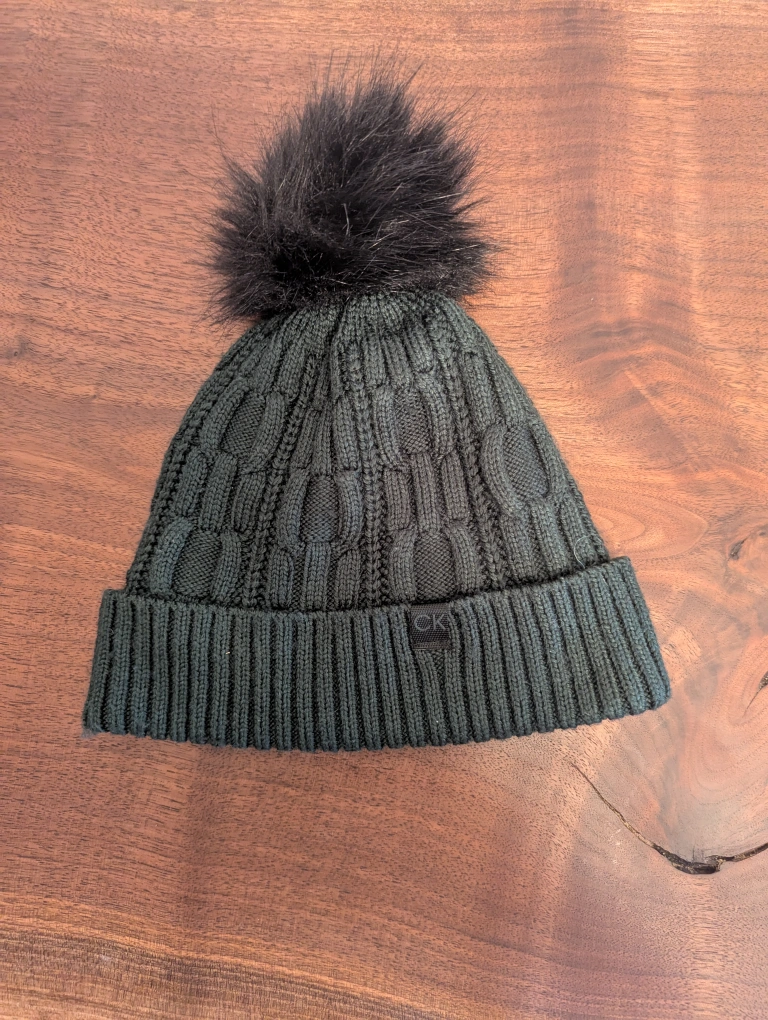 Warm winter beanie. Dark green colour. Features a black pom-pom and soft fleece lining. Cable knit design. Perfect for cold weather. Lightly used.