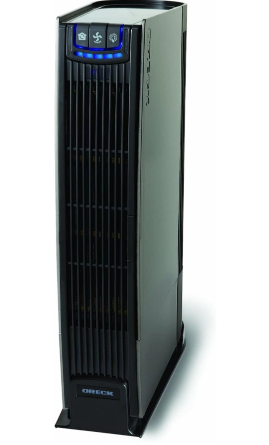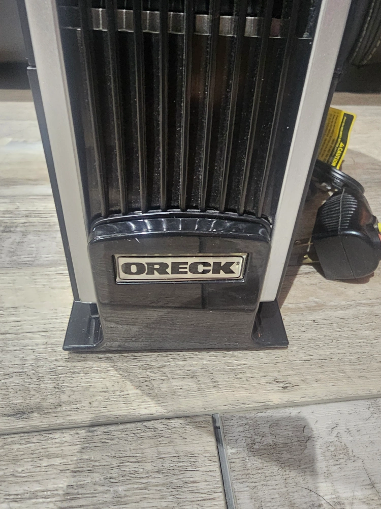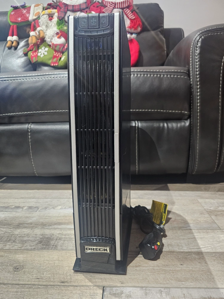Used Oreck air purifier. Sleek, black design. Multiple settings. Includes power cord.