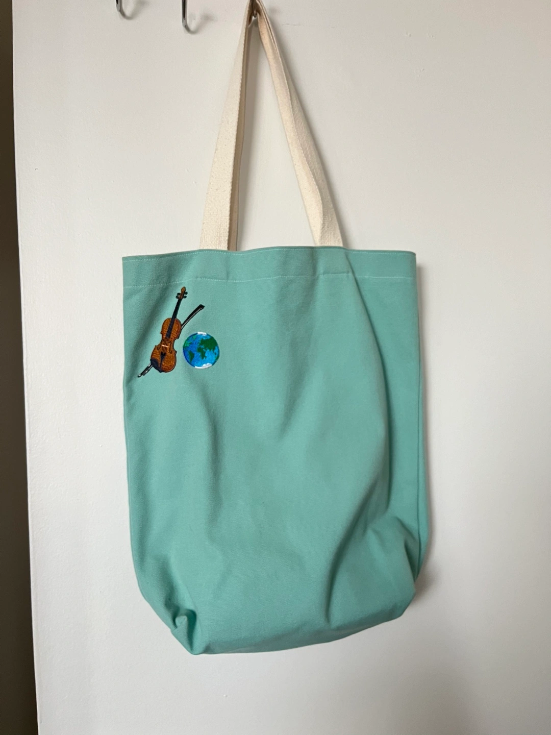 Light teal canvas tote bag. Features embroidered violin and globe. Cream-coloured straps. This was from Korea, very good material. It would fit a 13-15" laptop
