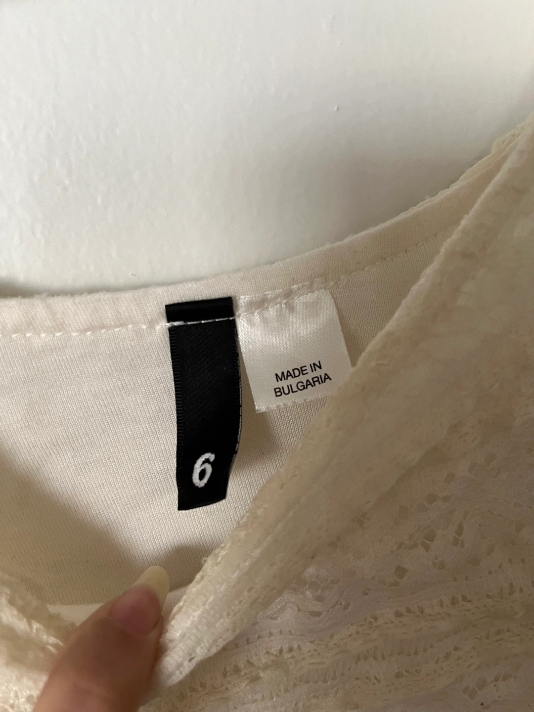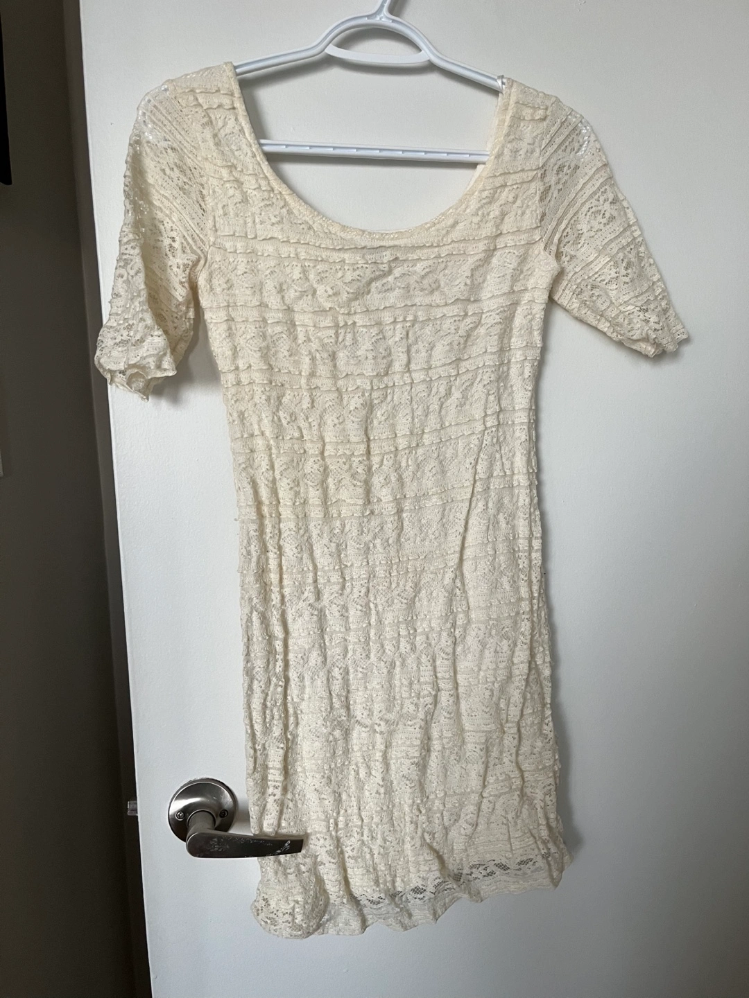 Off-white lace mini dress. Short sleeves. Round neckline. Fitted silhouette. Size 6 but fits tighter. Made in Bulgaria
