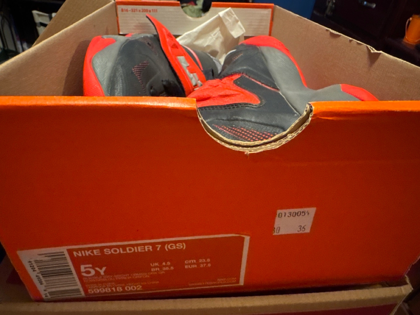Nike Soldier 7 GS basketball shoes. Size 5Y. Black, red, and grey colour scheme. In original box.