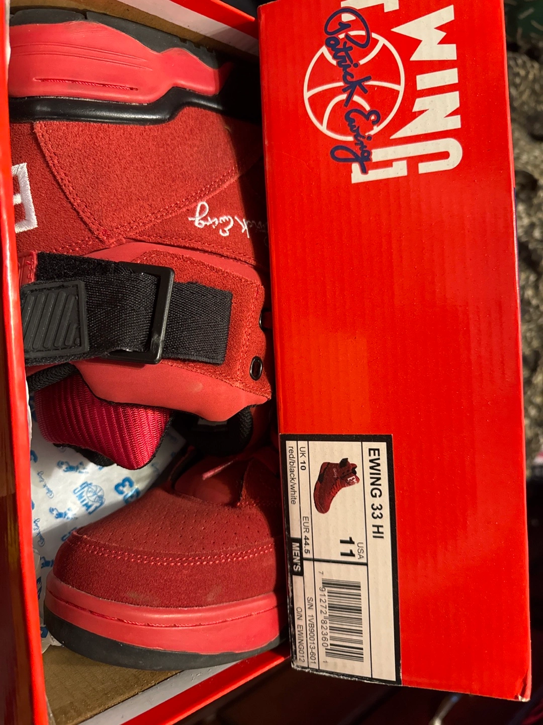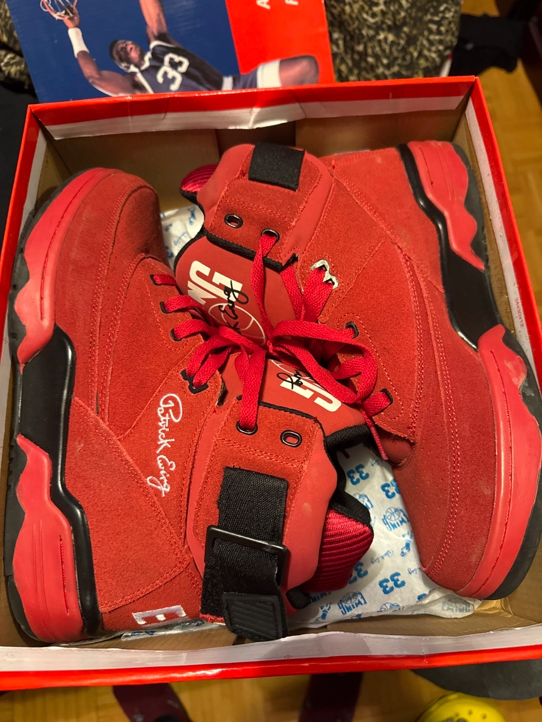 Men's red suede high-top basketball shoes. Size 11. Patrick Ewing signature.