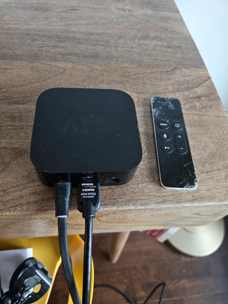 Apple TV media player. Includes remote with screen damage. but still works perfectly. HDMI cable included. And remote cable cord. Also it looks as if it's got a bunch of visible marks in it. But to the eye does not look like this. I thought it was dust and went to take a second photo after wiping it and I can still see the white marks in the camera. Not sure why exactly?