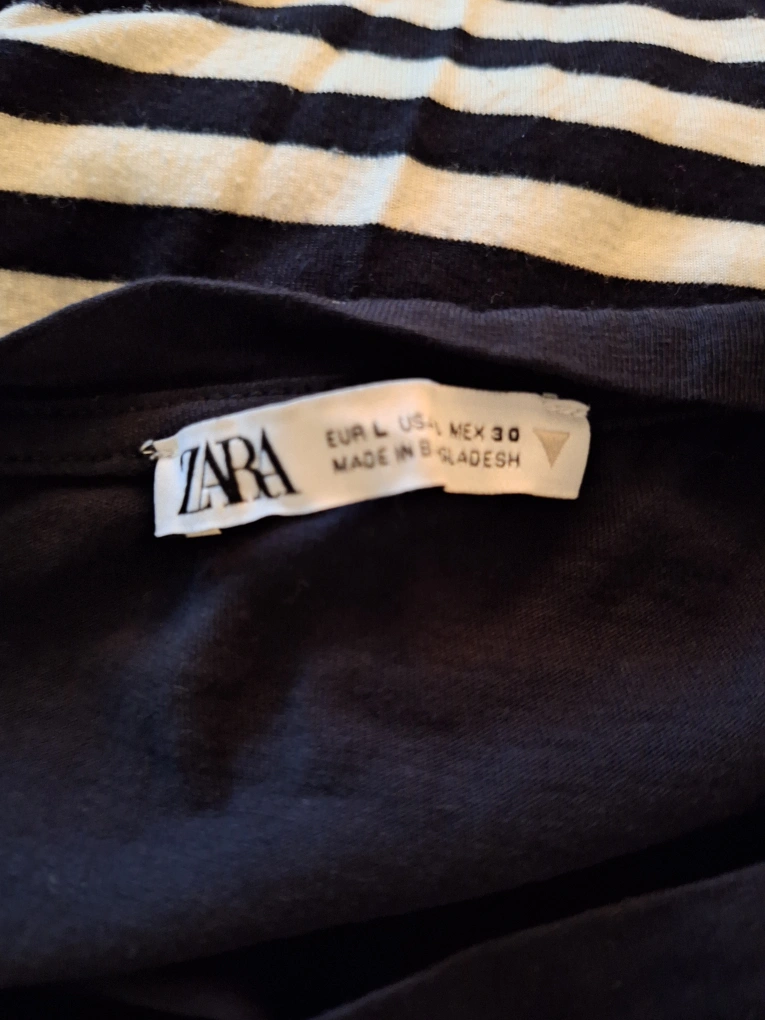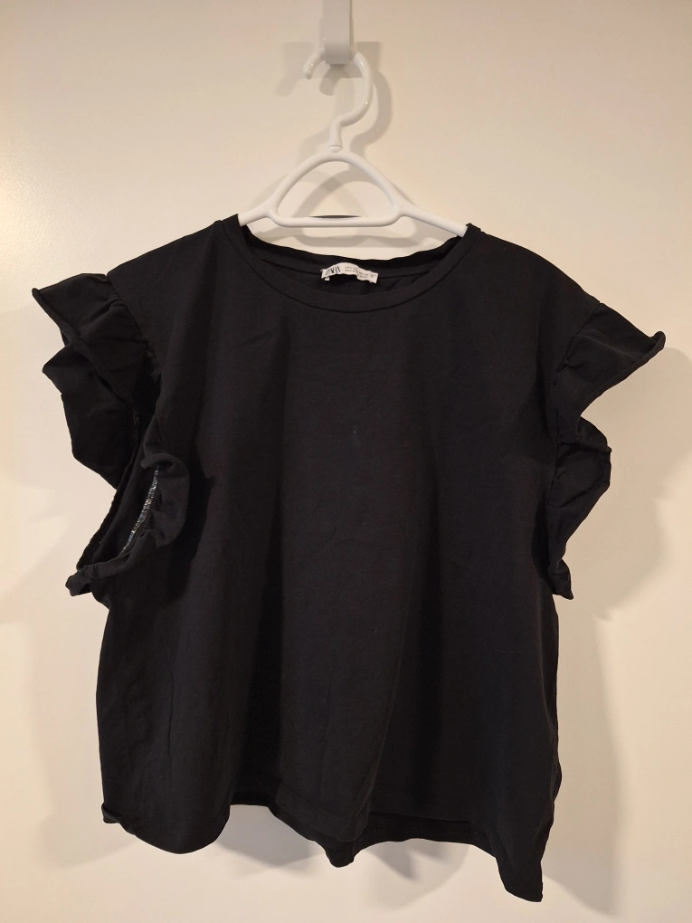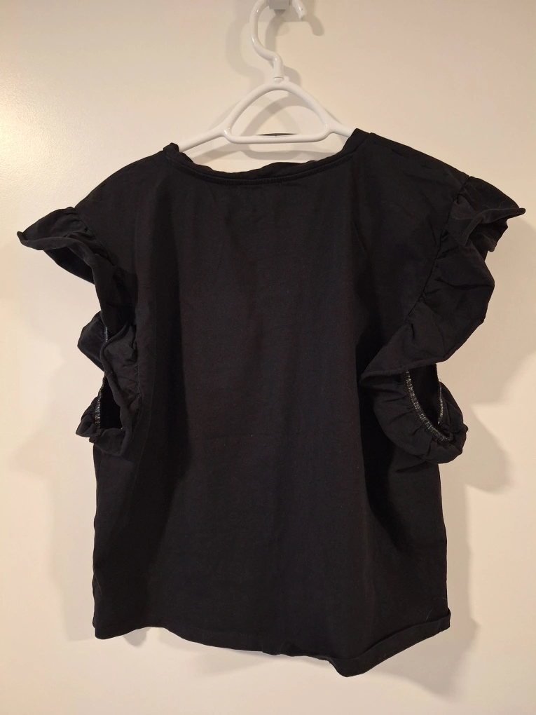 Black cotton t-shirt. Features ruffles on the sleeves. Size Large. Made in Bangladesh.