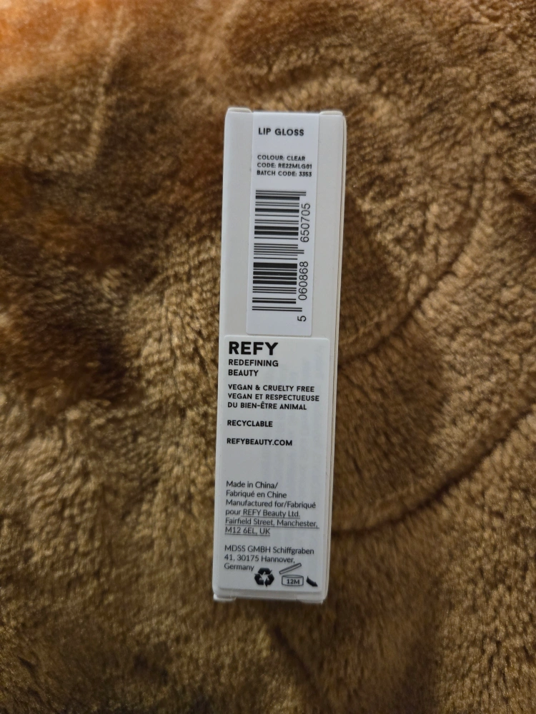 New, unused Refy lip gloss. Clear colour. 5 ml / 0.17 US fl. oz. Vegan and cruelty-free. Recyclable packaging. Made in China.